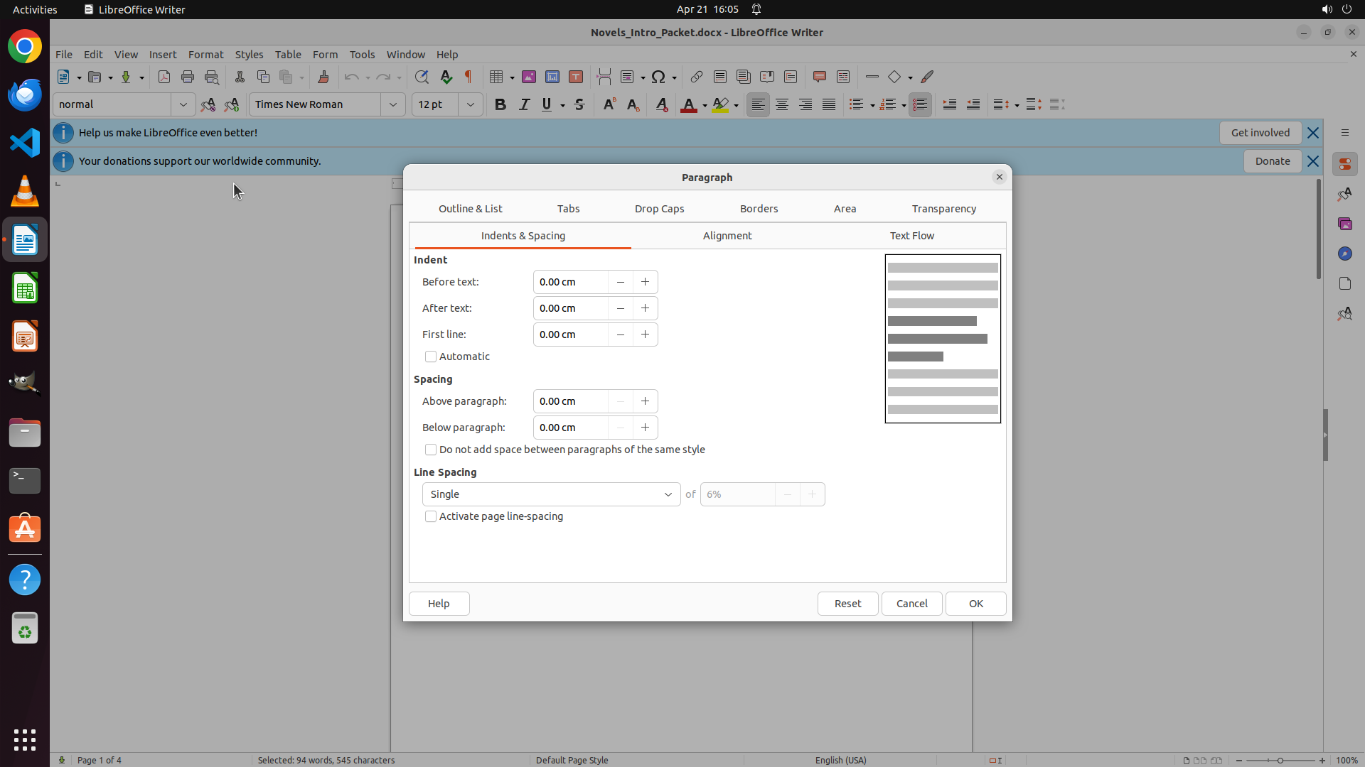 当前屏幕显示LibreOffice Writer文档已打开,文档标题为"Novels_Intro_Packet.docx"。文档包含多个段落: