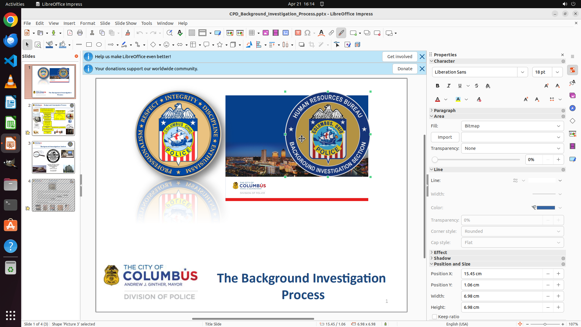 LibreOffice Impress is open with a presentation about "CPD_Background_Investigation_Process". The first slide is currently displayed, showing: