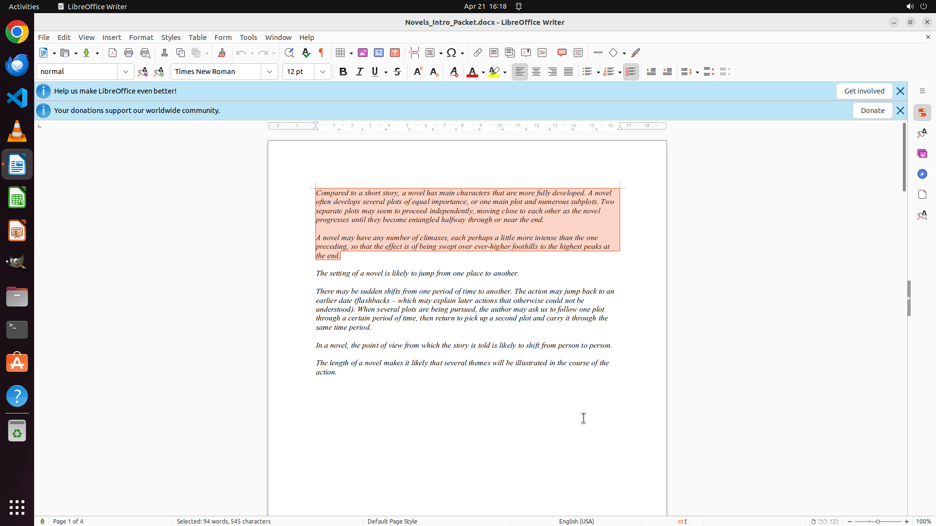 - The second paragraph beginning with 'A novel may have any number...' displays with double line spacing, showing visibly increased vertical space between lines compared to the third paragraph