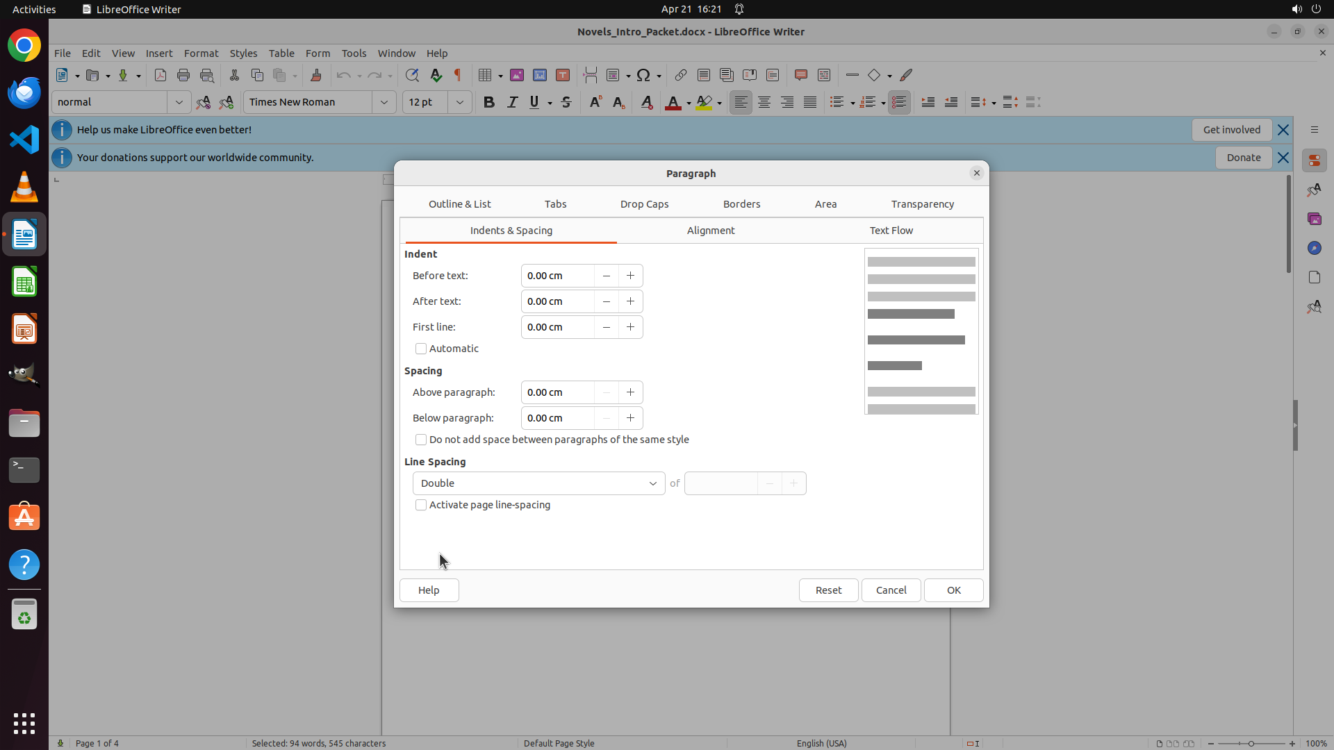 LibreOffice Writer 文档已打开,显示文档 "Novels_Intro_Packet.docx"。文档包含多个关于小说的段落: