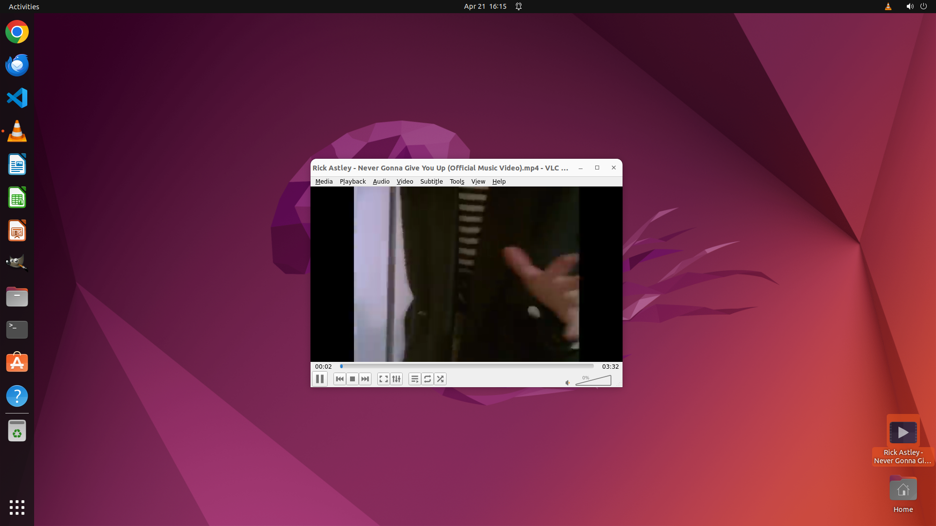 - VLC window title bar displays the video filename from the desktop (e.g., 'Rick Astley - Never Gonna Give You Up')