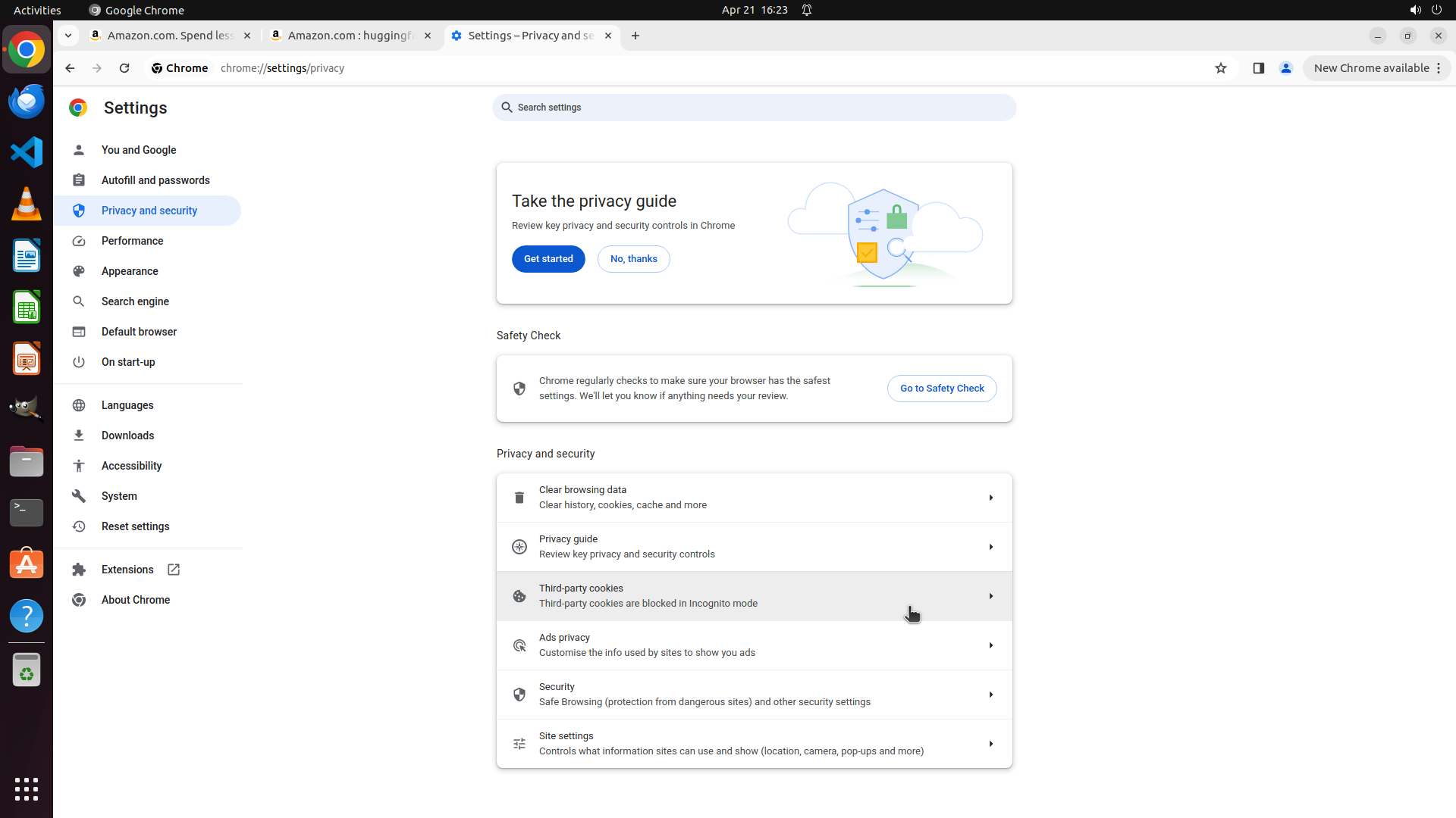 当前屏幕显示 Chrome 的 Privacy and security 设置页面。观察到:
