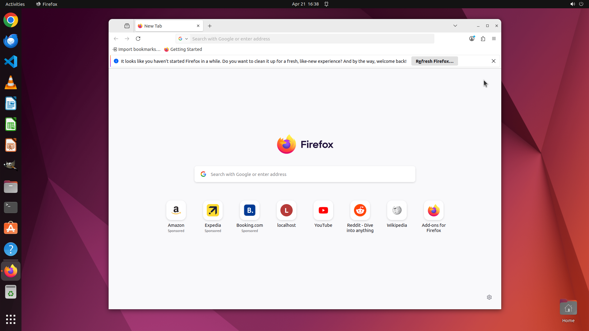 - 顶部有一个通知横幅:"It looks like you haven't started Firefox in a while. Do you want to clean it up for a fresh, like-new experience?"