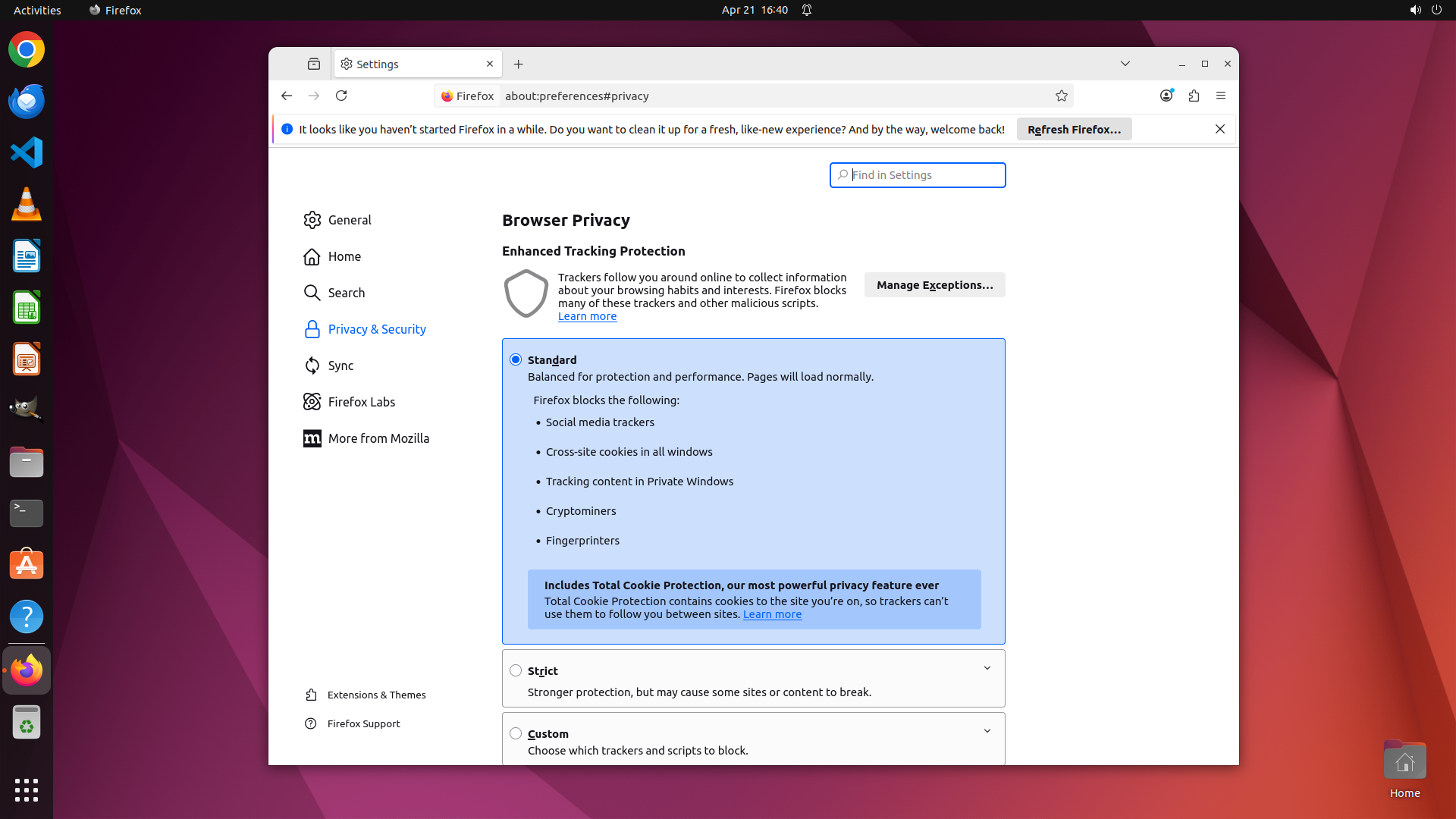 我将先关闭这个设置面板,然后访问 Firefox 的隐私设置。