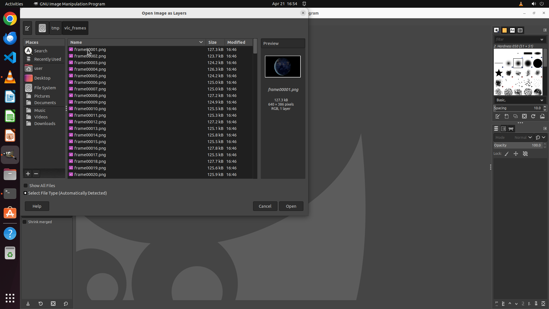2. 使用 File > Open as Layers 功能打开所有帧(/tmp/vlc_frames/frame_*.png)