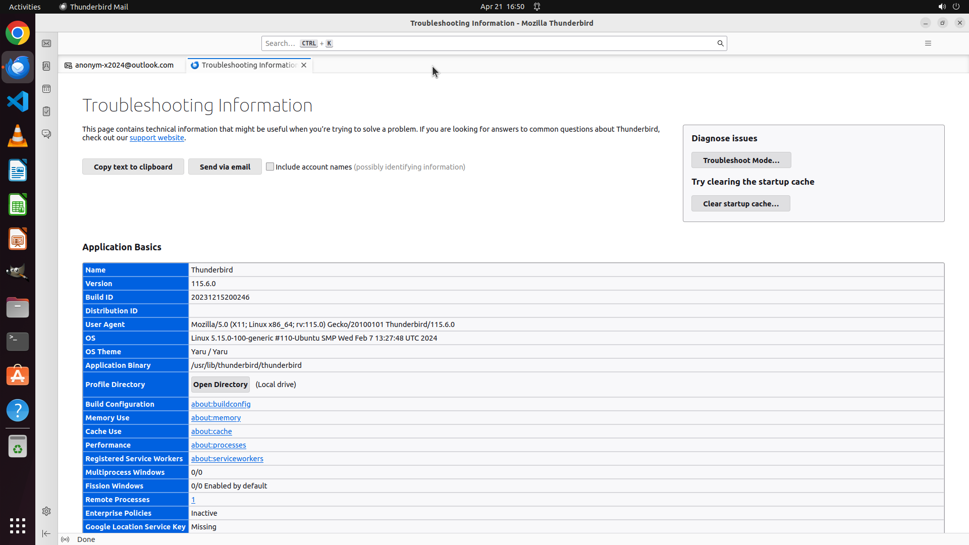 - 页面显示了 Application Basics 表格,包含 Thunderbird 版本、构建ID、Profile Directory 等信息