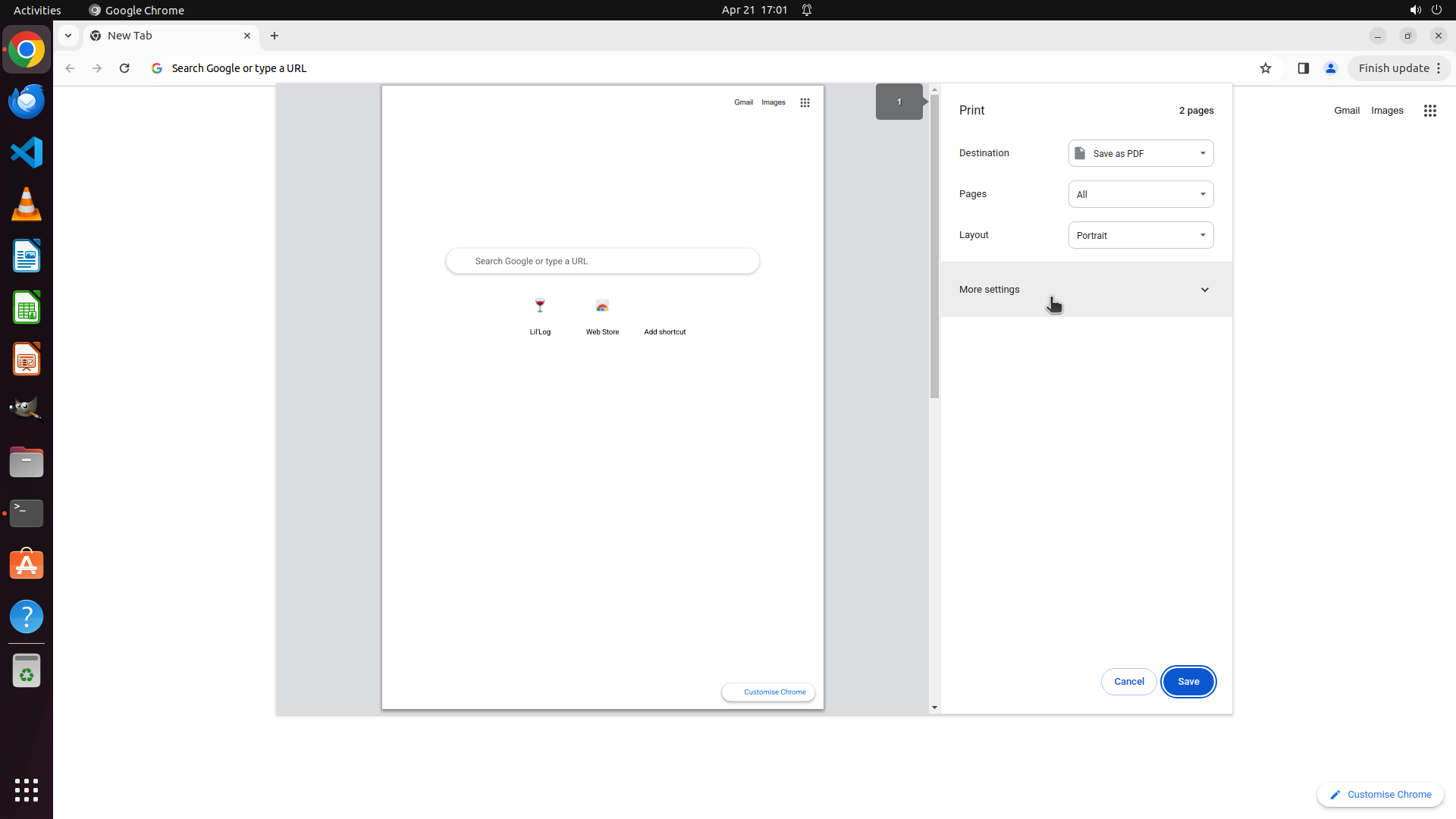 ## 6. 上一次操作的前50步操作简述 ### 步骤 1: - 描述: ``` #### 重要信息 当前屏幕显示 Chrome 浏览器已打开,并且打印对话框已经显示出来。打印对话框中: - Destination(目标)已设置为 "Save as PDF" - "More settings"(更多设置)部分尚未展开,需要点击展开才能访问边距设置 - 右下角有 "Cancel" 和 "Save" 按钮 #### 情况分析与思考过程 根据任务要求,我需要: 1. 展开 "More settings" 以访问边距设置 2. 将边距设置为 "None" 3. 保存到 Desktop 使用默认文件名 当前打印对话框已经打开,这是很好的起点。下一步需要点击 "More settings" 来展开更多选项,这样才能看到边距设置。从截图中可以看到 "More settings" 在右侧对话框中,带有一个下拉箭头,表明它可以被展开。 我将点击 "More settings" 来展开设置选项。 ``` - 操作: 1. 左键单击坐标 (0.744, 0.351) ### 步骤 2: - 描述: - 操作: 1. 左键单击坐标 (0.782, 0.522) ### 步骤 3: - 描述: ``` #### 重要信息 当前屏幕显示 Chrome 打印对话框已打开,并且: - "More settings" 部分已展开 - Margins(边距)下拉菜单已打开,显示选项:Default、None、Minimum、Custom - Destination 已设置为 "Save as PDF" - 当前 "Default" 被高亮选中 #### 情况分析与思考过程 根据任务要求,我需要将边距设置为 "None"。当前 Margins 下拉菜单已经打开,我可以清楚地看到 "None" 选项在列表中。这是任务的关键步骤之一。 我需要点击 "None" 选项来将边距设置为无。之后,我将点击 Save 按钮,然后在文件保存对话框中导航到 Desktop 并使用默认文件名保存。 当前进度: - ✅ 打印对话框已打开 - ✅ Destination 已设置为 "Save as PDF" - ✅ "More settings" 已展开 - 🔄 正在设置 Margins 为 "None"(下拉菜单已打开) - ⏳ 点击 Save 按钮 - ⏳ 导航到 Desktop 并保存 ``` - 操作: 1. 左键单击坐标 (0.75, 0.556) ### 步骤 4: - 描述: ``` #### 重要信息 当前屏幕显示 Chrome 打印对话框: - Destination 已设置为 "Save as PDF" - "More settings" 已展开 - Margins(边距)已成功设置为 "None" - 右下角有 "Cancel" 和 "Save" 按钮 #### 情况分析与思考过程 上一步操作成功将边距设置为 "None"。现在所有打印设置都已配置完成: - ✅ Destination: Save as PDF - ✅ Margins: None 下一步是点击 "Save" 按钮,这将打开文件保存对话框。在文件保存对话框中,我需要导航到 Desktop 目录并使用默认文件名保存 PDF 文件。 当前进度: - ✅ 打印对话框已打开 - ✅ Destination 已设置为 "Save as PDF" - ✅ "More settings" 已展开 - ✅ Margins 已设置为 "None" - 🔄 点击 Save 按钮(当前步骤) - ⏳ 导航到 Desktop 并保存 ``` - 操作: 1. 左键单击坐标 (0.815, 0.834) ### 步骤 5: - 描述: ``` #### 重要信息 文件保存对话框已成功打开: - 文件名已设置为 "New Tab.pdf"(默认文件名) - 当前位置是 "Downloads" 目录(在路径栏中显示) - 左侧边栏显示可导航的位置,包括 Desktop 选项 #### 情况分析与思考过程 上一步操作成功点击了 Save 按钮,打开了文件保存对话框。现在我需要: 1. 点击左侧边栏的 "Desktop" 导航到 Desktop 目录 2. 然后点击 Save 按钮保存文件 当前进度: - ✅ 打印对话框已打开 - ✅ Destination 已设置为 "Save as PDF" - ✅ "More settings" 已展开 - ✅ Margins 已设置为 "None" - ✅ 点击 Save 按钮打开文件保存对话框 - 🔄 导航到 Desktop(当前步骤) - ⏳ 使用默认文件名保存 PDF 下一步操作:点击左侧边栏的 "Desktop" 选项来导航到 Desktop 目录。 ``` - 操作: 1. 左键单击坐标 (0.333, 0.44) ### 步骤 6: - 描述: - 操作: 1. 左键单击坐标 (0.716, 0.358) </SITUATION>