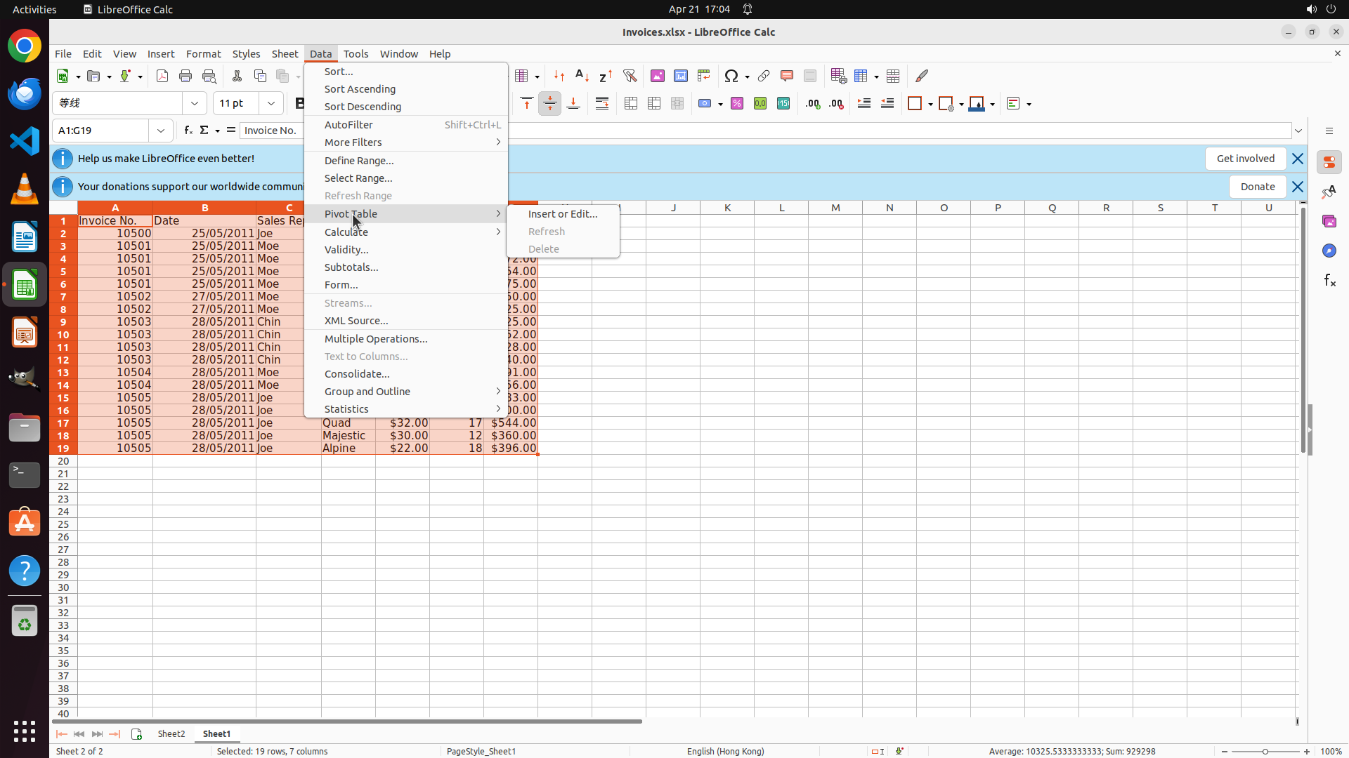 - LibreOffice Calc 已打开,显示 "Invoices.xlsx" 文件