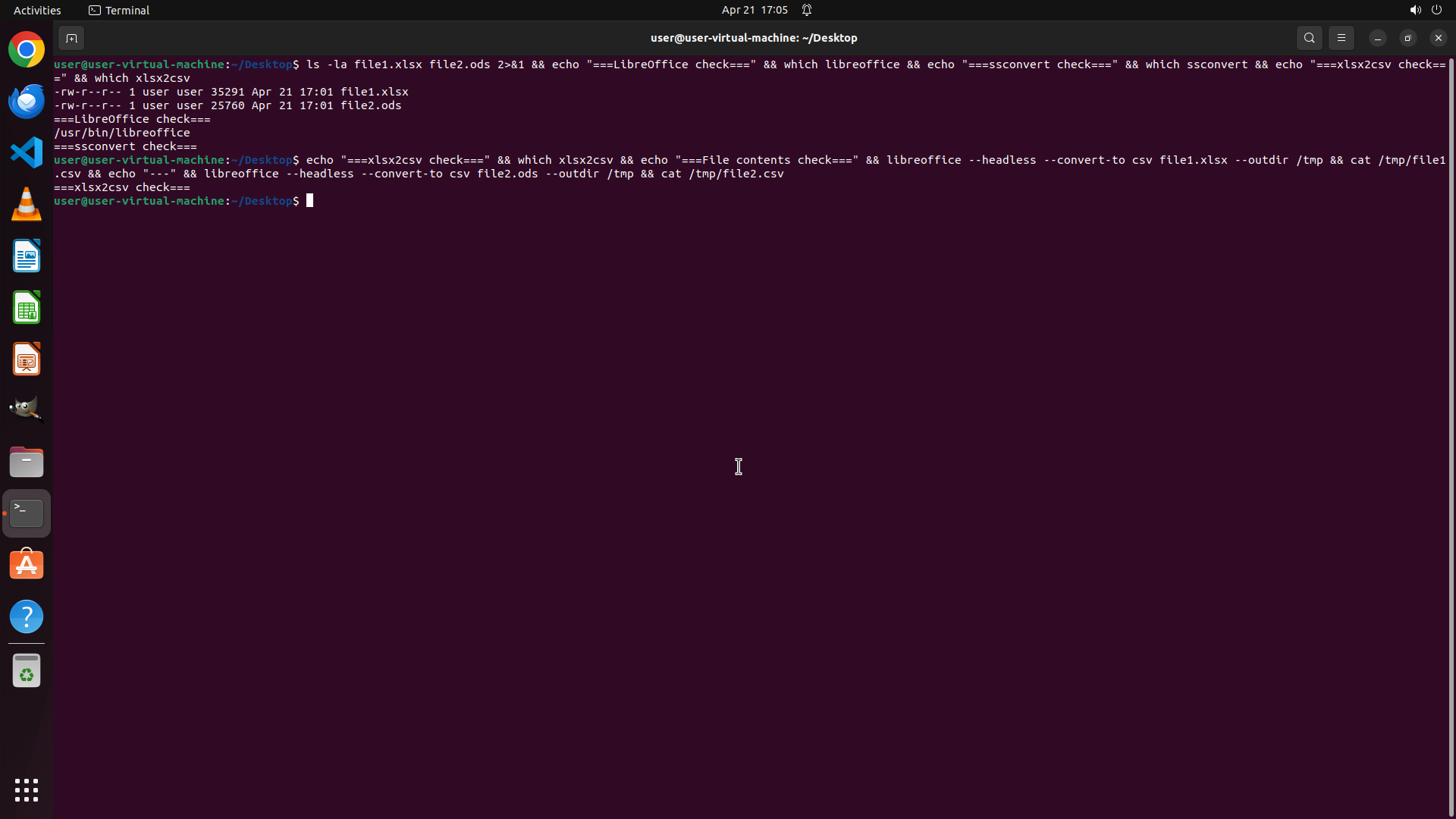 1. 输入文本: echo "===xlsx2csv check===" && which xlsx2csv && echo "===File contents check===" && libreoffice --headless --convert-to csv file1.xlsx --outdir /tmp && cat /tmp/file1.csv && echo "---" && libreoffice --headless --convert-to csv file2.ods --outdir /tmp && cat /tmp/file2.csv