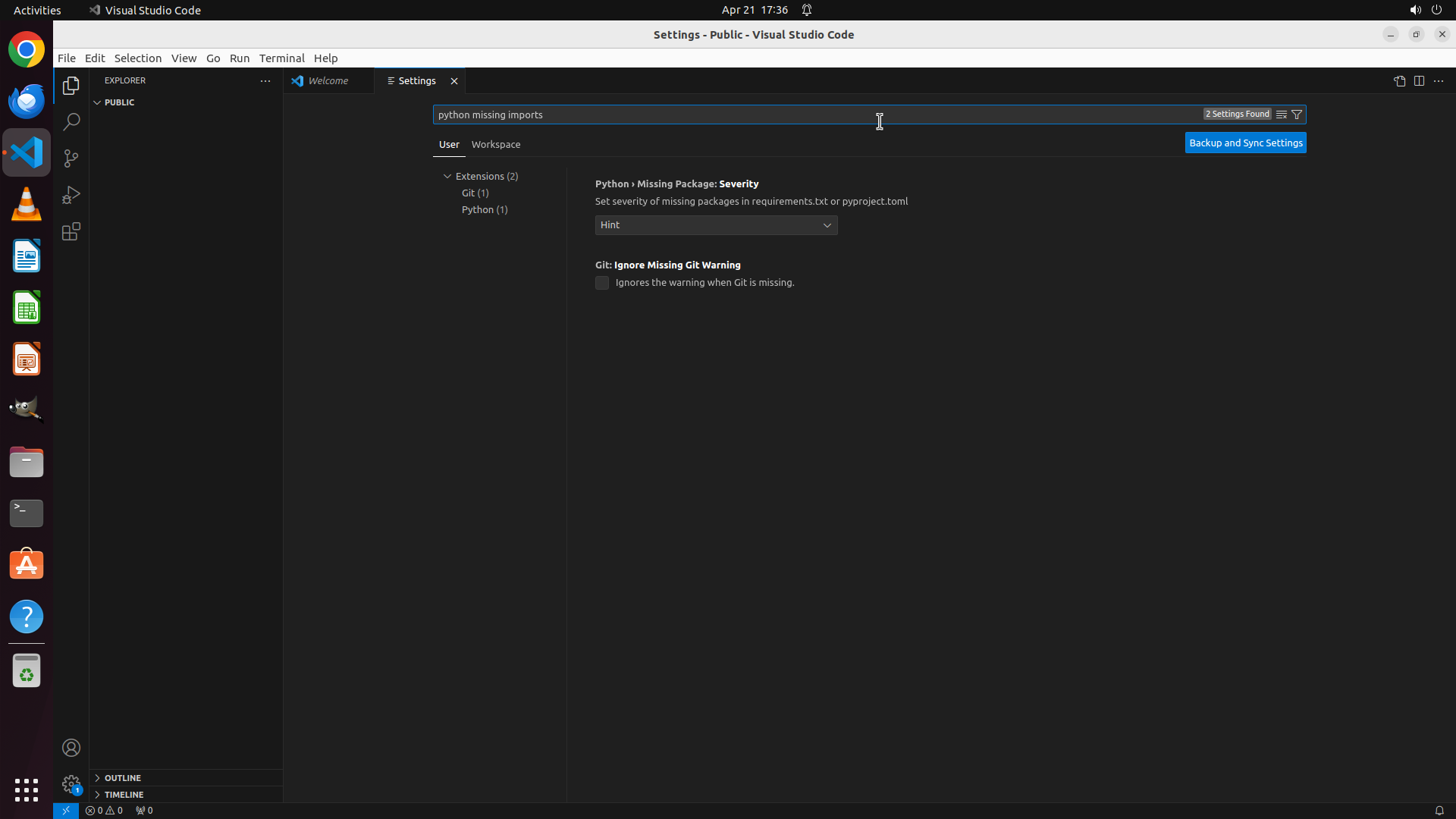 你的任务是:借助工具,来操作一台电脑来达成任务: Please modify VS Code's settings to disable error reporting for Python missing imports.。