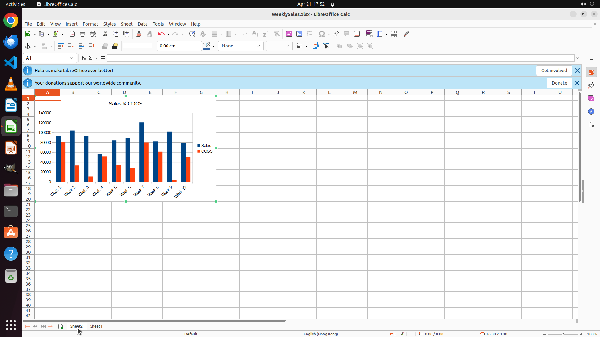 - The chart is still visible in Sheet1 with the title "Sales & COGS"