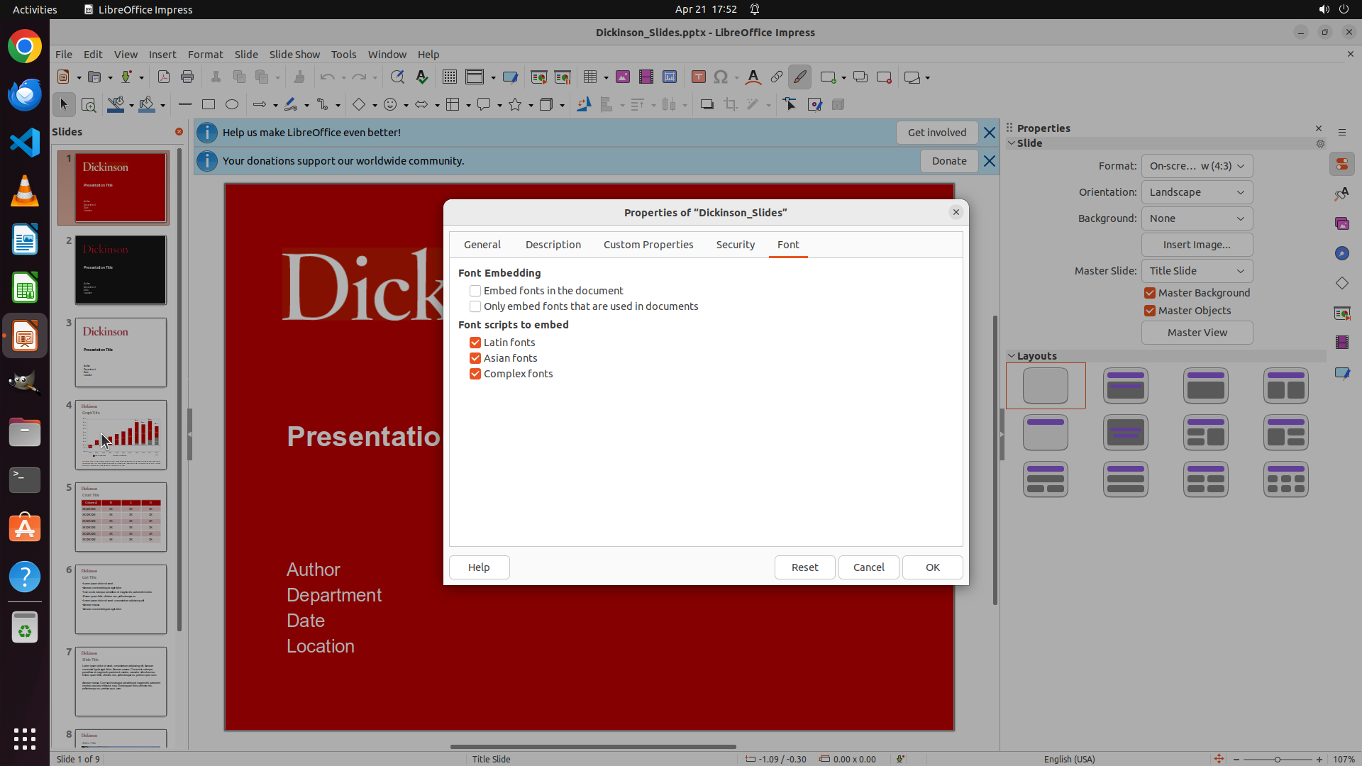 ## 4. 上一次操作的前 5 步操作简述 ### 步骤 1: - 描述: ``` #### 从截图中观察到的信息 1. LibreOffice Impress is currently open with "Dickinson_Slides.pptx" (shown in title bar) 2. The presentation has 9 slides total (shown at bottom: "Slide 1 of 9") 3. Currently viewing Slide 1, which is a title slide with "Dickinson" as the main title 4. The left panel shows thumbnails of slides 1-8 (and likely 9 below) 5. The interface shows standard LibreOffice Impress layout with toolbars, slide panel, and properties panel 6. There are information banners at the top about donations #### 下一步计划 I need to: 1. Find the full file path of the presentation 2. Check if there are speaker notes and view their content 3. Identify available tools for extracting notes and creating .docx files 4. Determine the Desktop path I'll start by accessing the File menu to find the file path, and the View menu to check for Notes view. Let me click on the File menu first to see file properties or recent files which should show the full path. ``` I'll help you extract the speaker notes from the presentation. Let me start by gathering the necessary information. - 操作: 1. 左键单击坐标 (0.046, 0.069) 2. 等待 0.5 秒 </SITUATION>