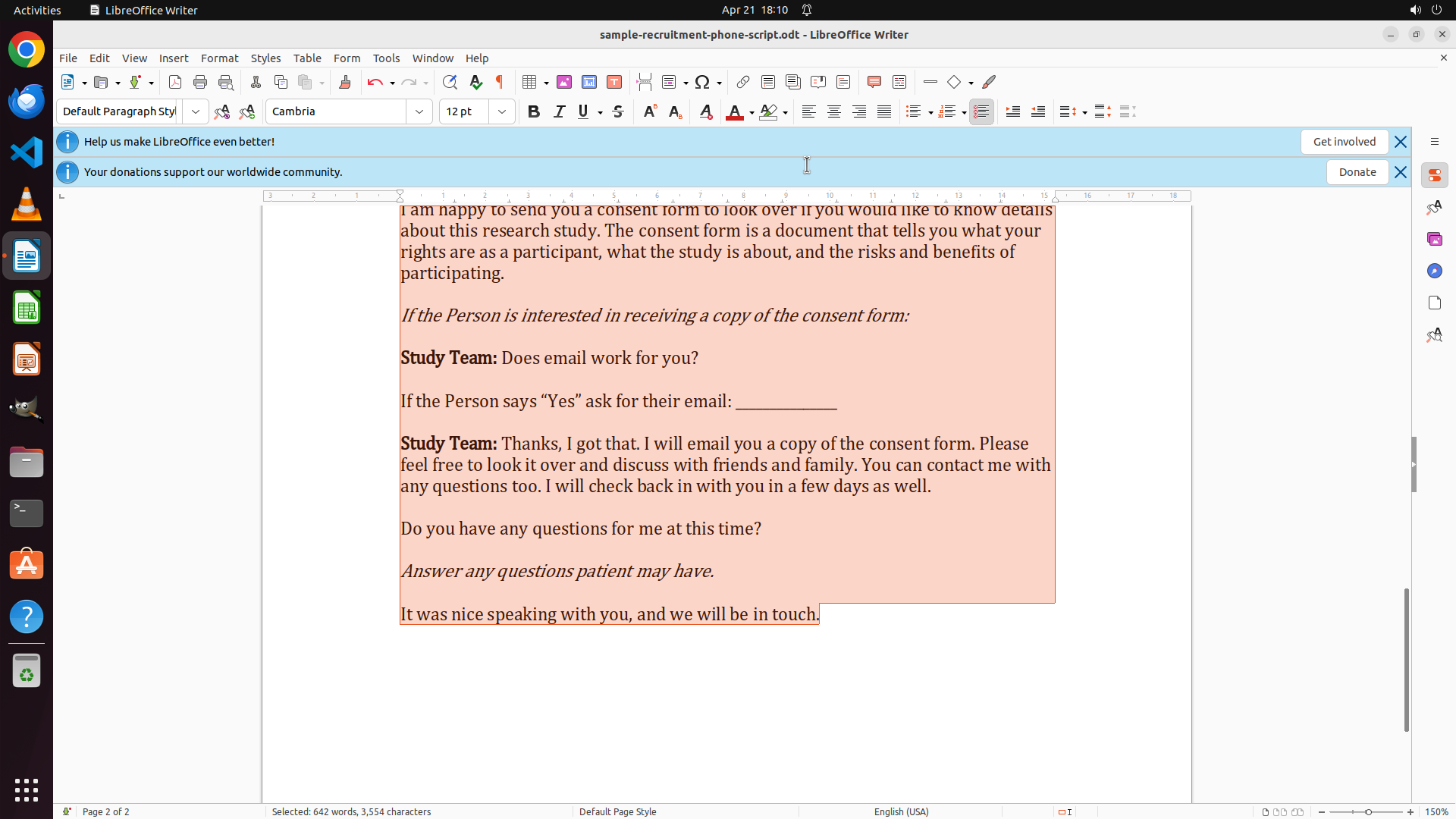 ## 6. 上一次操作的前50步操作简述 ### 步骤 1: - 描述: ``` #### 重要信息 当前屏幕显示 LibreOffice Writer 中打开了一个名为 "sample-recruitment-phone-script.odt" 的文档。文档中可以看到有两处 "UCSF" 文本被黄色高亮标记: 1. "from the UCSF [name of group]" 2. "Dr. UCSF researcher's name" 文档显示为第1页,共2页。需要移除所有黄色高亮。 #### 情况分析与思考过程 根据策略树,任务分为三步: 1. 选择文档中所有文本 (Ctrl+A) 2. 移除高亮(点击高亮颜色下拉菜单,选择"无颜色") 3. 验证没有高亮文本剩余 这是第一个操作,我应该先执行 Ctrl+A 选择所有文本,然后才能一次性移除所有高亮。选择全部文本是移除所有高亮的最有效方法。 ``` - 操作: 1. 按下键盘按键: ctrl, a ### 步骤 2: - 描述: #### 重要信息 当前屏幕显示 LibreOffice Writer 中打开了 "sample-recruitment-phone-script.odt" 文档。所有文本已被选中(显示为粉红色/浅红色背景)。文档中仍有两处 "UCSF" 文本带有黄色高亮: 1. "from the UCSF [name of group]" 2. "Dr. UCSF researcher's name" 状态栏显示 "Selected: 1,014 words, 3,554 characters",确认 Ctrl+A 成功选择了整个文档。 #### 情况分析与思考过程 策略树的第一步(选择所有文本)已完成。现在需要执行第二步:移除黄色高亮。 在 LibreOffice Writer 中移除高亮的步骤: 1. 点击工具栏中的高亮颜色下拉按钮(带有下拉箭头的高亮标记图标) 2. 选择 "No Color" 选项来移除所有高亮 我可以看到工具栏中有一个高亮按钮(看起来像一个荧光笔图标),旁边有下拉箭头。我需要点击这个下拉箭头来打开颜色选择菜单,然后选择"无颜色"选项。 这是最有效的方法,因为所有文本已经被选中,一次操作就可以移除所有高亮。 - 操作: 1. 左键单击坐标 (0.538, 0.134) </SITUATION>
