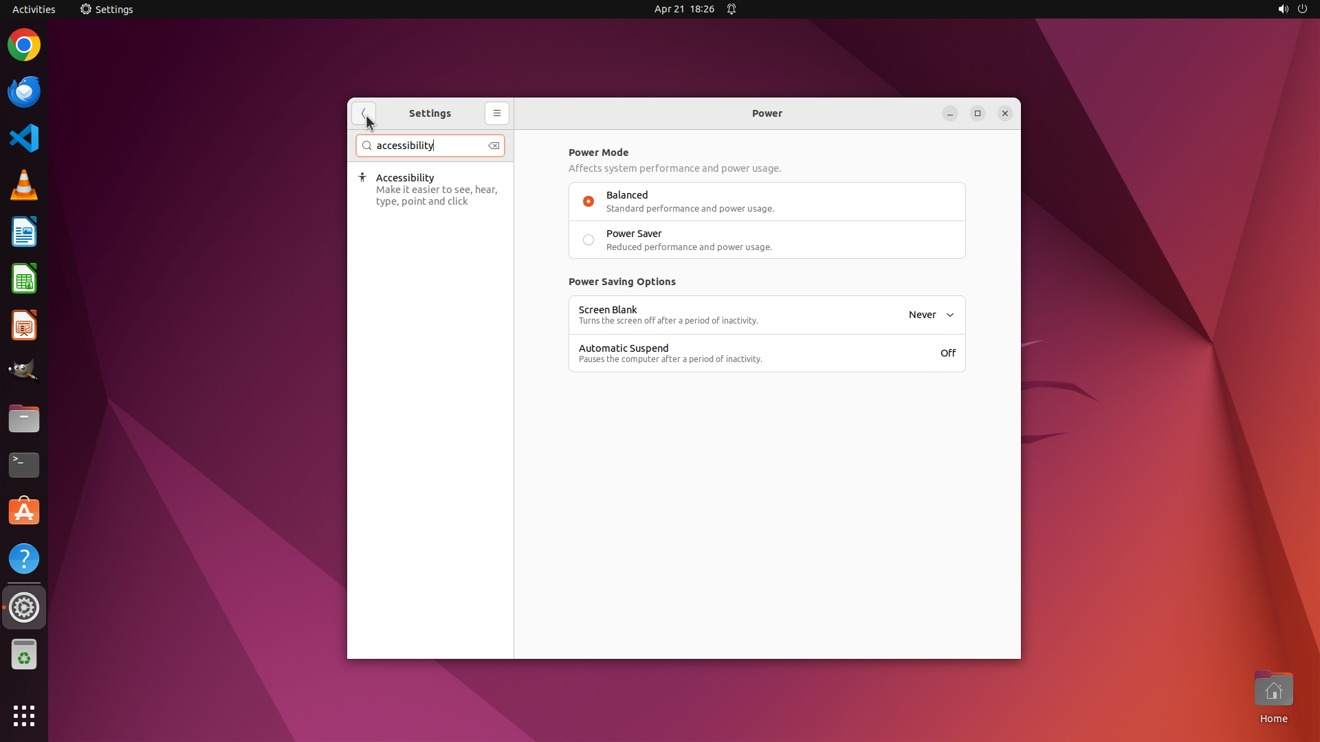 Settings 应用已打开,当前显示 Power(电源)设置面板。左侧边栏显示了多个设置类别。上一步点击了搜索图标(放大镜),现在应该可以输入搜索词来查找 Accessibility 设置。