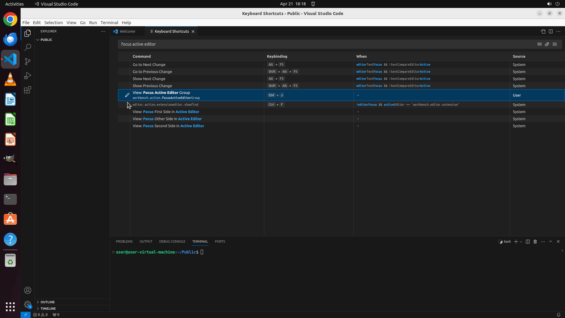 - The "View: Focus Active Editor Group" command shows "Ctrl + J" as the keybinding in the list