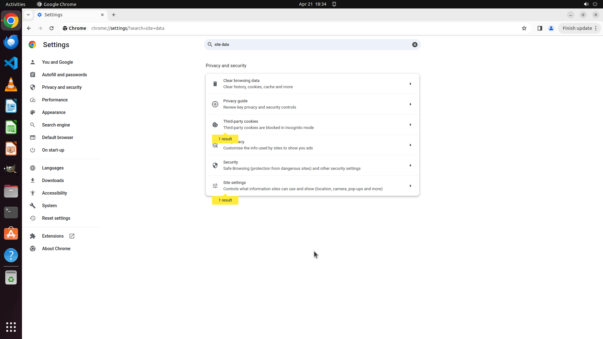 The search for "site data" has returned results. I can see "1 result" labels in yellow highlighting certain options in the Privacy and security section. The visible options include: