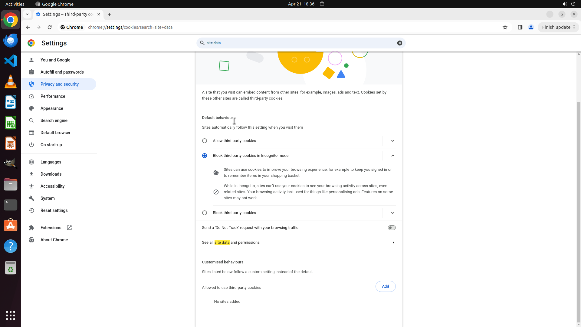 The previous action successfully navigated to the "Third-party cookies" page (chrome://settings/cookies?search=site+data). The page shows: