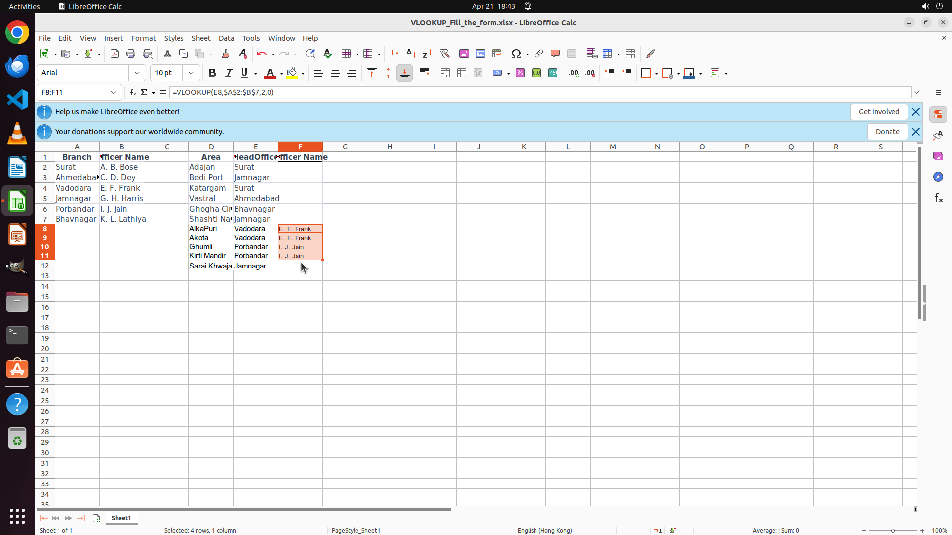 3. F8 成功显示 "E. F. Frank",这是正确的结果(Vadodara 对应的官员)