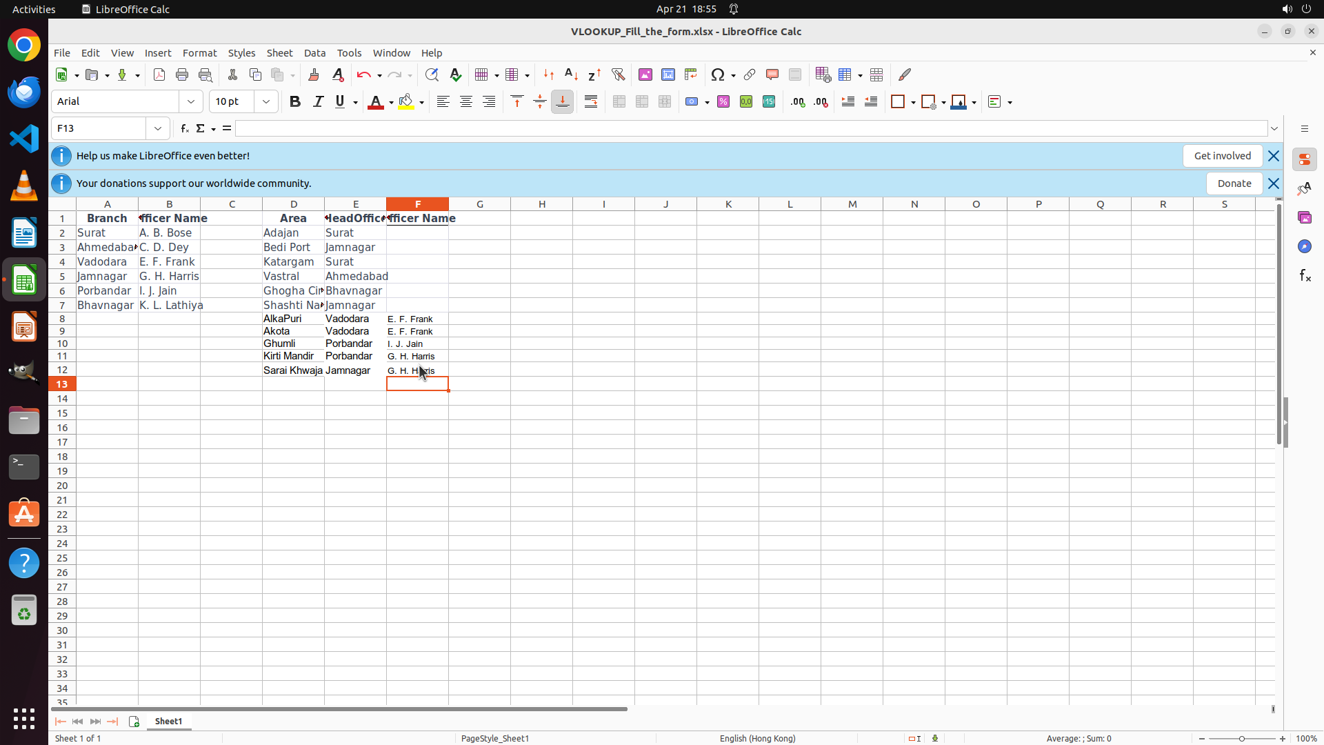 2. F12 现在显示 "G. H. Harris",这是正确的结果(Jamnagar 对应的官员)