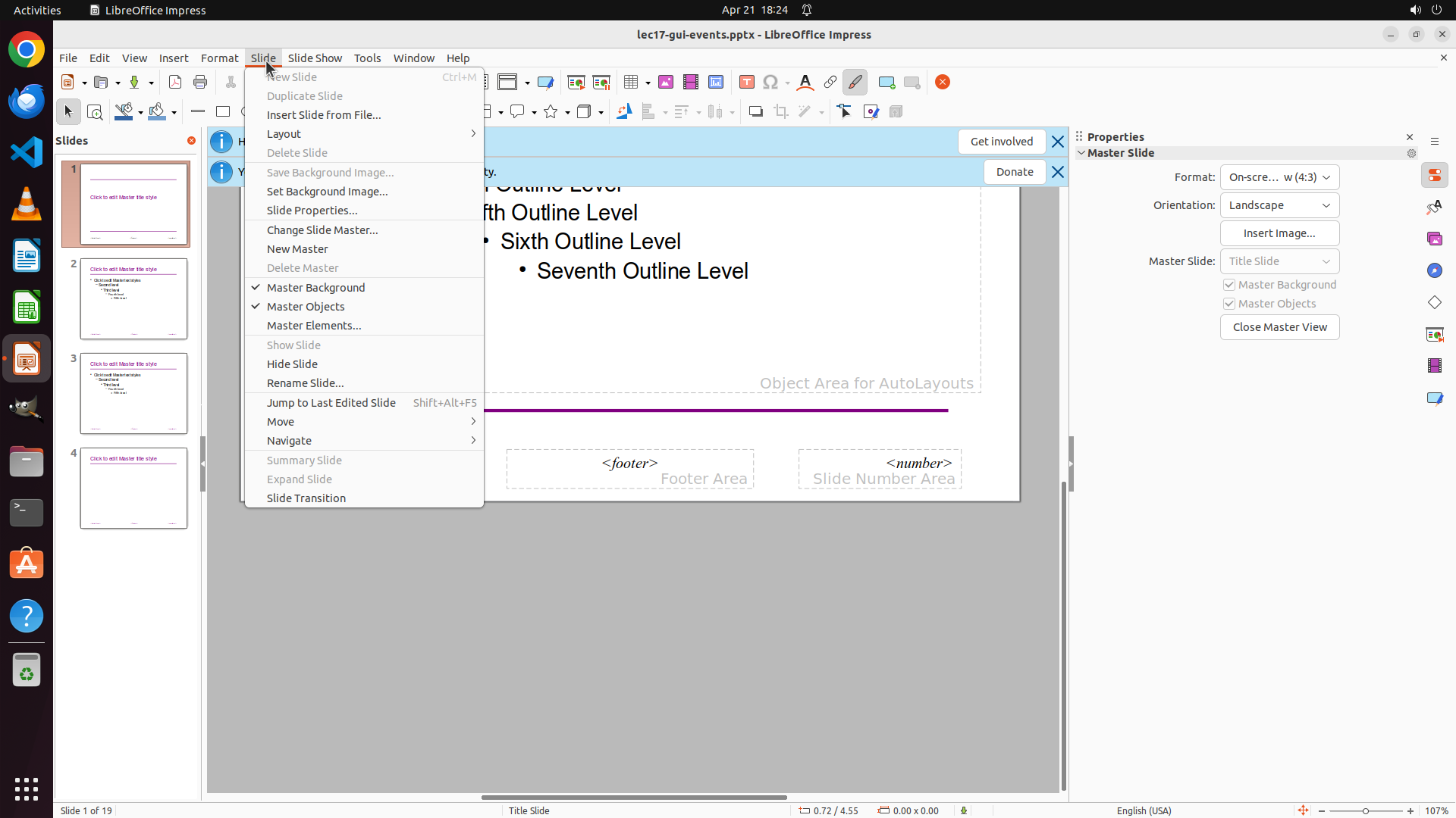 在 LibreOffice Impress 中,背景设置通常可以通过 "Slide" 菜单访问。让我尝试点击顶部菜单栏的 "Slide" 菜单,看看是否有 "Slide Properties" 或 "Master Slide" 相关的选项可以设置背景颜色。
