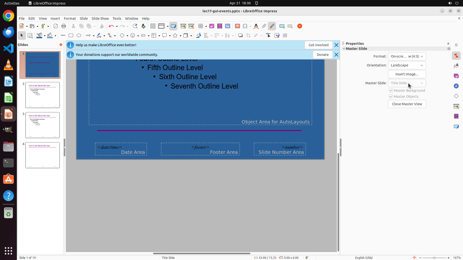 - 右侧 Properties 面板显示当前选中的是 "Title Slide" 母版