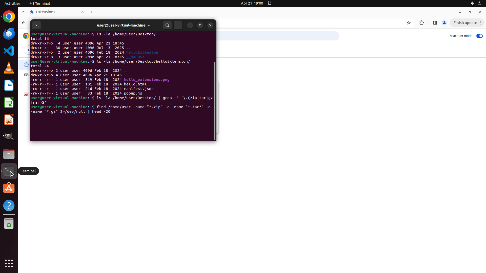 1. 输入文本: ls -la /home/user/Desktop/helloExtension/,并按回车提交