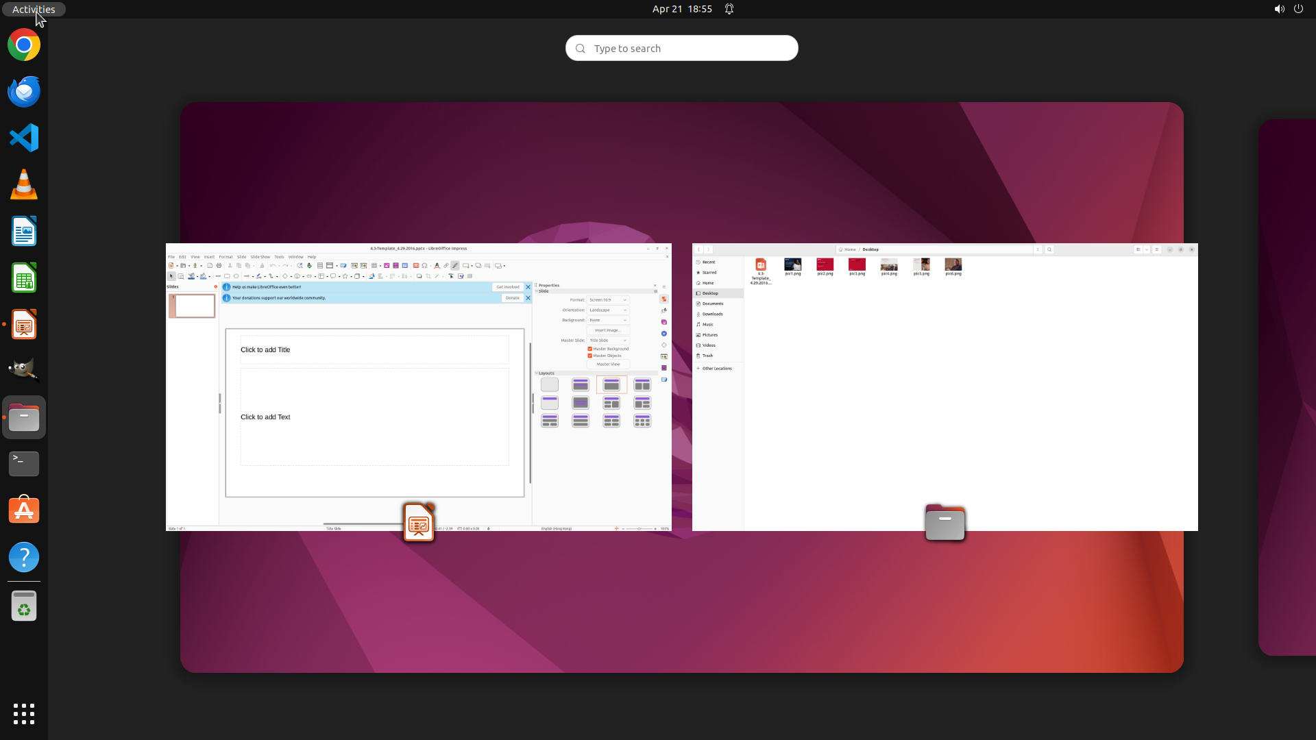 下一步行动:需要打开LibreOffice Impress。可以通过点击Activities按钮搜索,或者使用终端启动。我注意到左侧边栏有一个类似LibreOffice的图标,但最好通过Activities搜索确认。