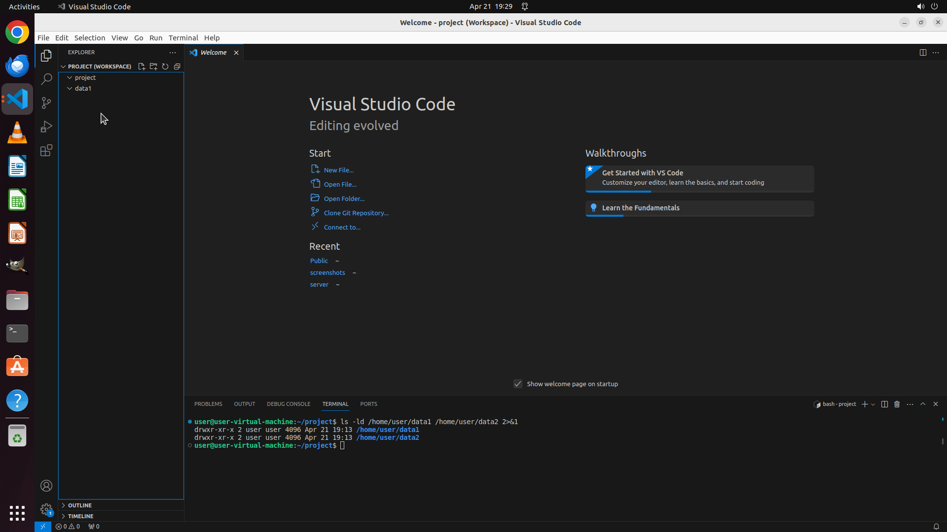 - The terminal shows both /home/user/data1 and /home/user/data2 exist (drwxr-xr-x permissions)