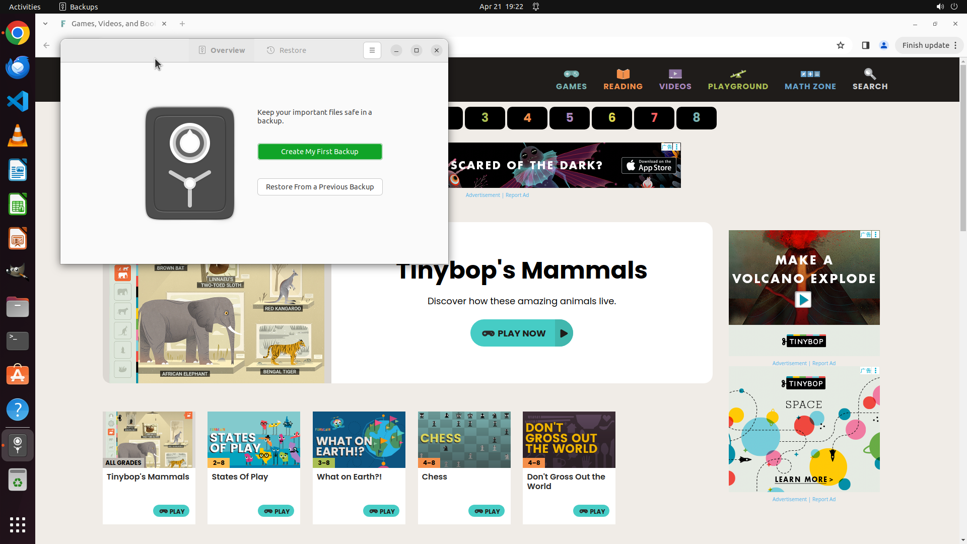 ## 4. 上一次操作的前 5 步操作简述 ### 步骤 1: - 描述: ``` #### 从截图中观察到的信息 1. Chrome浏览器已经打开,当前显示的是funbrain.com网站 2. 地址栏显示"funbrain.com",页面标题为"Games, Videos, and Books" 3. 右上角有一个"Can't update Chrome"的更新通知弹窗,提示Chrome无法更新到最新版本 4. 页面内容显示的是儿童教育游戏网站Funbrain的主页,包含按年级分类的游戏(Pre-K到8年级) 5. 浏览器界面显示这是Ubuntu Linux系统(从顶部状态栏可以看出) 6. 左侧任务栏显示多个应用程序图标 #### 下一步计划 首先关闭右上角的Chrome更新通知弹窗,然后导航到chrome://settings/onStartup检查启动设置,这是排查funbrain.com自动打开问题的第一步。需要检查启动时是否设置为"打开特定页面"并查看具体设置了哪些页面。 ``` - 操作: 1. 左键单击坐标 (0.986, 0.126) ### 步骤 2: - 描述: ``` #### 从截图中观察到的信息 1. Chrome更新通知弹窗已成功关闭,右上角不再显示"Can't update Chrome"通知 2. Chrome浏览器当前打开的是funbrain.com网站,地址栏显示"funbrain.com" 3. 页面是Funbrain儿童教育游戏网站,包含按年级分类的游戏内容(Pre-K到8年级) 4. 浏览器顶部显示Ubuntu Linux系统环境 5. 左侧任务栏显示多个应用程序图标 #### 下一步计划 需要导航到chrome://settings/onStartup检查Chrome的启动设置。首先点击地址栏,然后输入URL并访问设置页面。 ``` - 操作: 1. 左键单击坐标 (0.5, 0.081) 2. 输入文本: chrome://settings/onStartup,并按回车提交 </SITUATION>