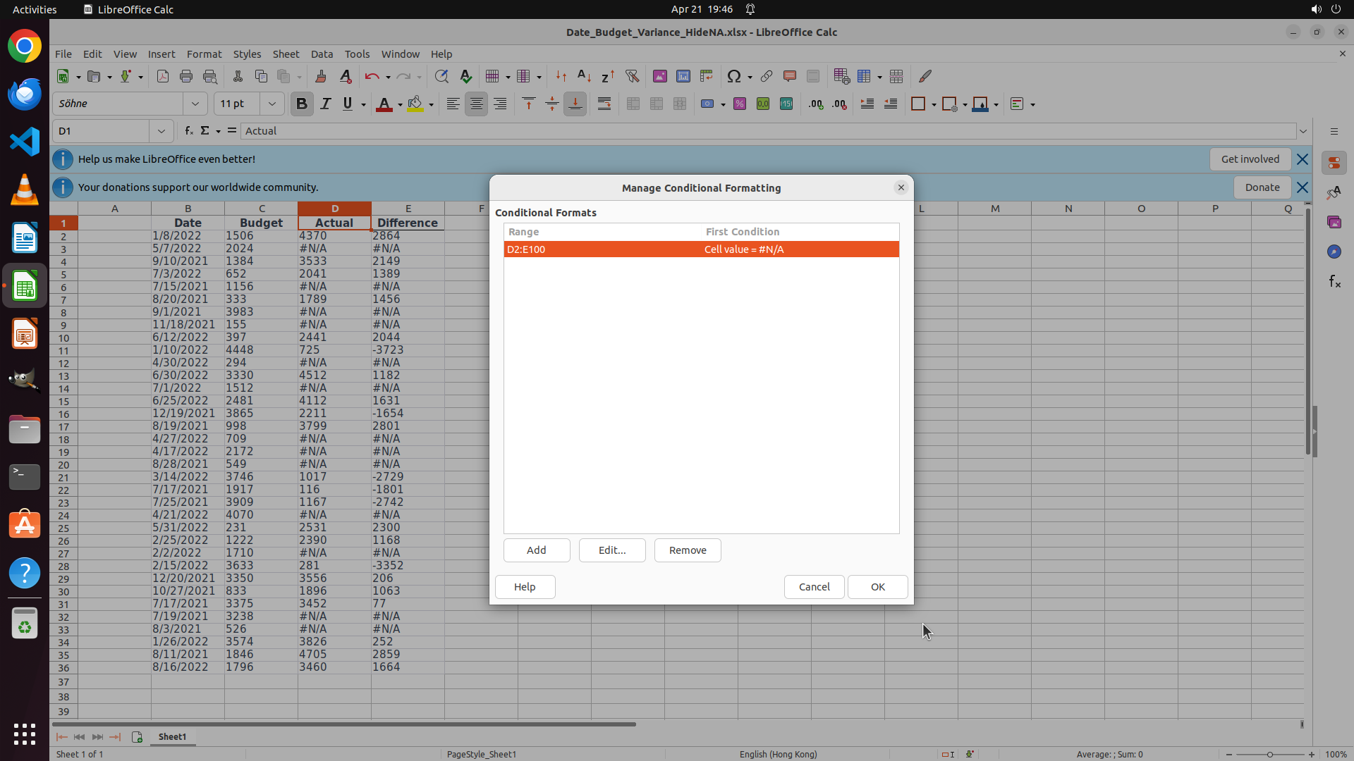 - "Conditional Formatting for D1" 对话框已重新打开