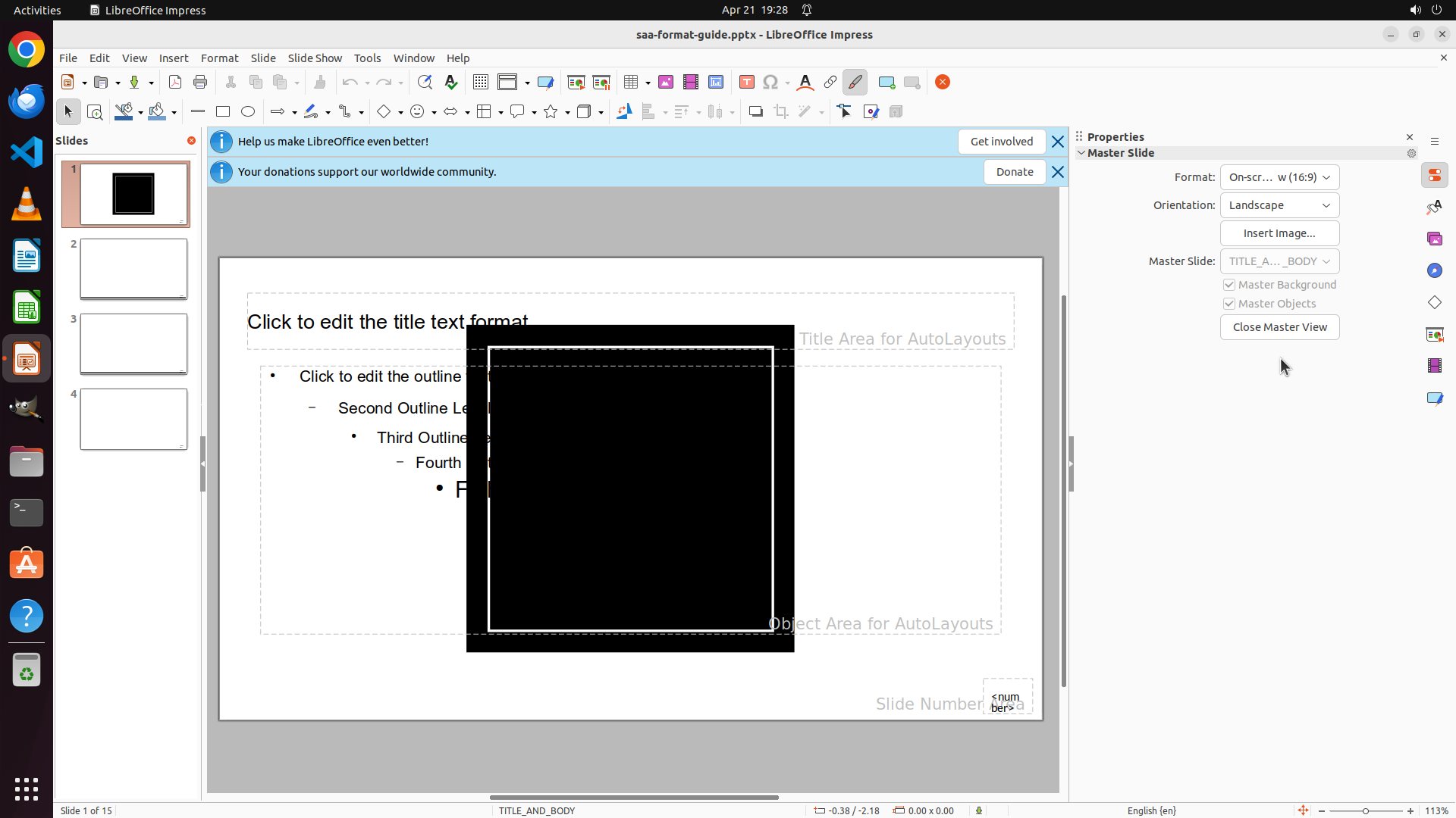 1. LibreOffice Impress is open with presentation "saa-format-guide.pptx"