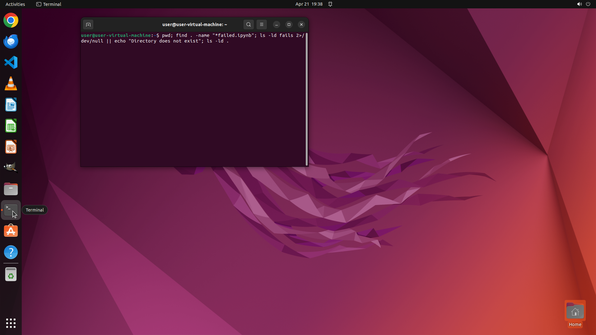 ## 4. 上一次操作的前 5 步操作简述 ### 步骤 1: - 描述: ``` #### 从截图中观察到的信息 当前显示的是 Ubuntu Linux 桌面,壁纸是紫色水母图案。左侧有一个应用启动栏,可以看到多个应用图标,包括 Chrome 浏览器、VS Code、终端等。桌面没有打开任何窗口。我需要打开终端来获取关于当前工作目录、文件匹配情况和目录权限的信息。 #### 下一步计划 1. 点击左侧的终端图标打开终端 2. 在终端中执行命令获取所有需要的信息(当前工作目录、匹配文件列表、fails目录是否存在、写入权限) ``` 我需要打开终端来获取这些信息。 - 操作: 1. 左键单击坐标 (0.019, 0.625) </SITUATION>