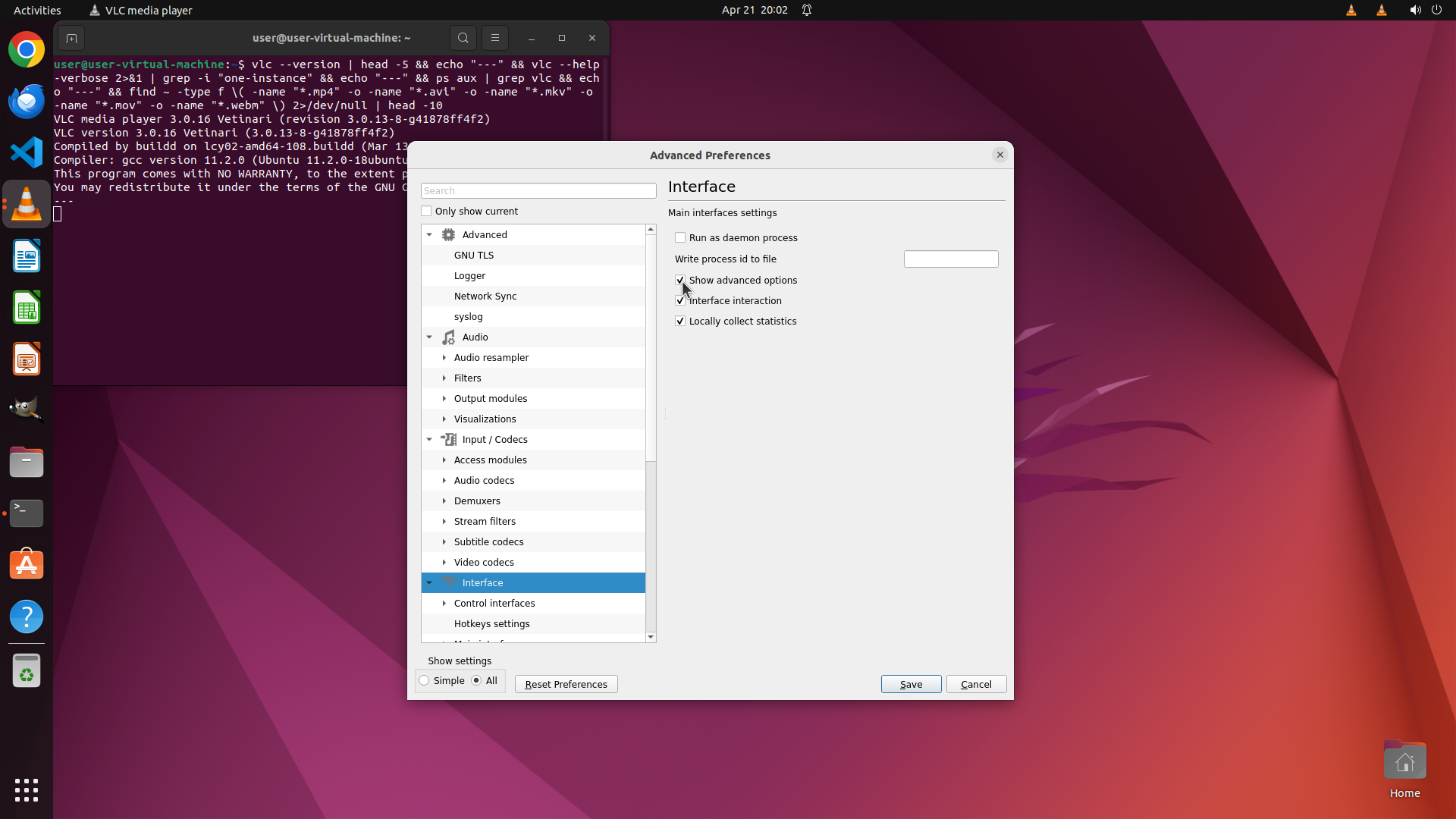 The previous action successfully navigated to the Interface section. However, I notice that the "Show advanced options" checkbox is unchecked. In VLC preferences, many advanced settings including the "Use only one instance when started from file manager" option are only visible when "Show advanced options" is enabled.
