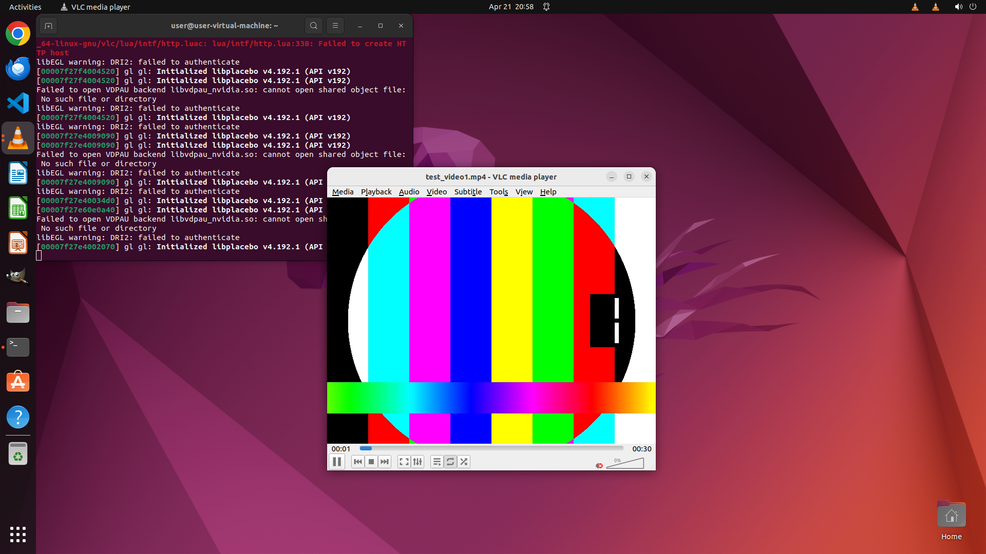 - The first VLC instance is successfully playing test_video1.mp4 (showing colorful test pattern with "test_video1.mp4" text)