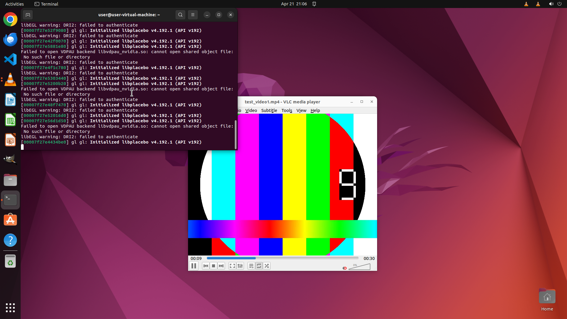 - The first VLC instance is playing test_video1.mp4 successfully (showing colorful test pattern)