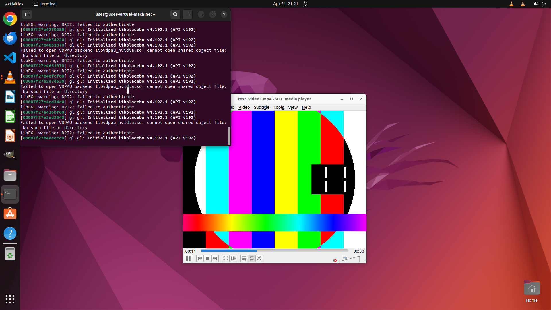 - The first VLC instance is playing test_video1.mp4 successfully (showing colorful test pattern with moving elements)