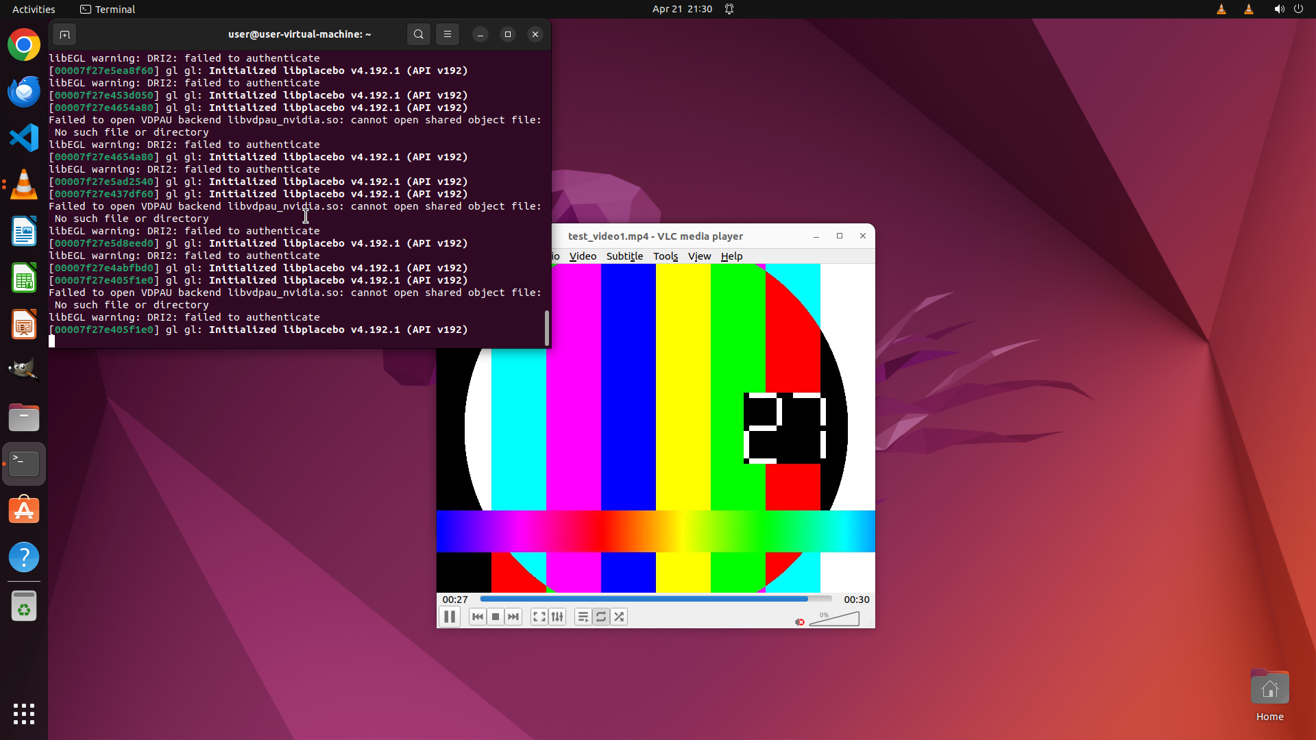 - The first VLC instance is playing test_video1.mp4 successfully (showing colorful test pattern)