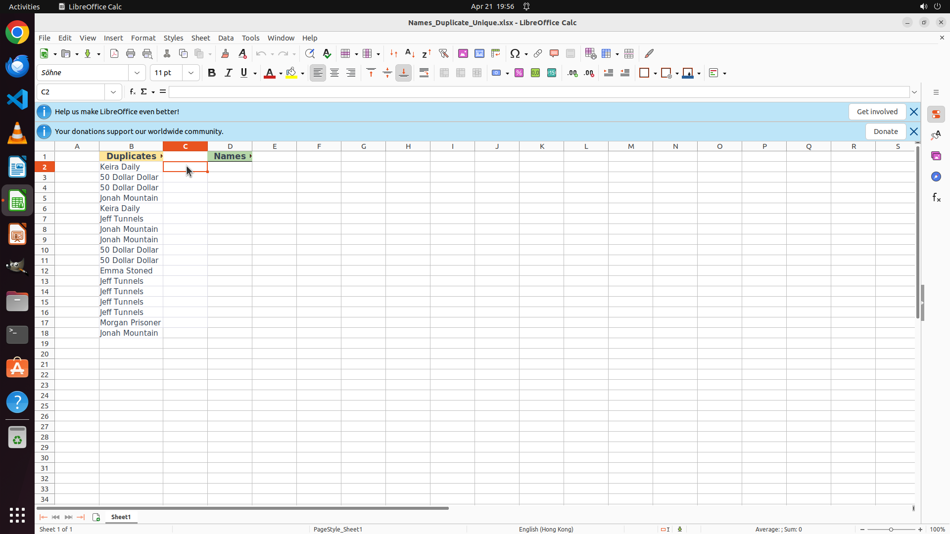 - LibreOffice Calc 已打开,文件名为 "Names_Duplicate_Unique.xlsx"