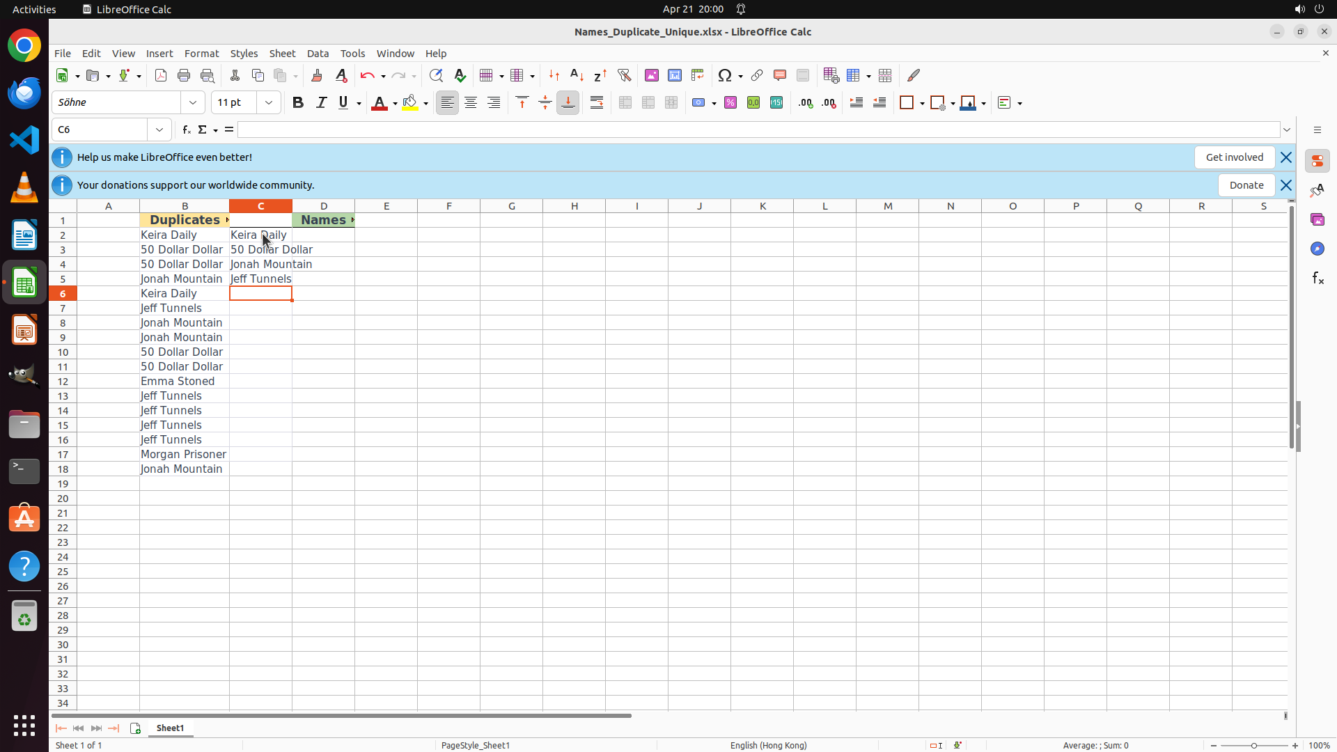 - LibreOffice Calc 已打开,文件名为 "Names_Duplicate_Unique.xlsx"
