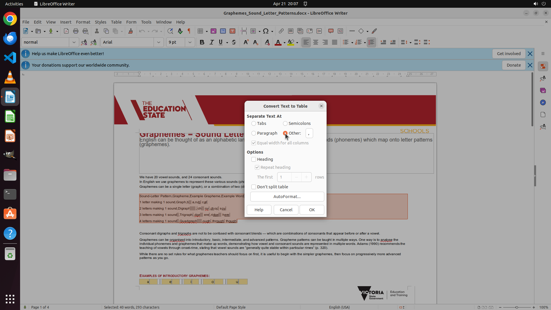 ## 6. 上一次操作的前50步操作简述 ### 步骤 1: - 描述: ``` #### 重要信息 LibreOffice Writer 已打开,文档中包含逗号分隔的文本数据。我看到文档中间有类似表格数据的文本: - 表头行:Sound-Letter Pattern,Grapheme,Example Grapheme,Example Word - 数据行:1 letter making 1 sound,Graph,b a,rub cat - 2 letters making 1 sound,Digraph,ch oy,shop say - 3 letters making 1 sound,Trigraph,igh ore,high tore - 4 letters making 1 sound,Quadgraph,ough ough,though through 需要将这段逗号分隔的文本转换为表格。 #### 情况分析与思考过程 根据策略树,任务分为三步: 1. 选择逗号分隔的文本 2. 使用 Table > Convert > Text to Table 转换 3. 验证表格格式 当前第一步是选择文本。我需要: 1. 点击文本开始位置("Sound-Letter Pattern") 2. 拖动选择所有需要转换的文本行 3. 然后使用菜单进行转换 让我先点击文本开始位置,然后拖动选择所有逗号分隔的数据。 ``` - 操作: 1. 按住鼠标左键从坐标 (0.252, 0.626) 拖动到坐标 (0.43, 0.706) ### 步骤 2: - 描述: ``` #### 重要信息 文本已成功选中!我可以看到逗号分隔的文本已经被高亮选中(红色/橙色高亮),包括: - 表头行:Sound-Letter Pattern,Grapheme,Example Grapheme,Example Word - 数据行:1 letter making 1 sound,Graph,b a,rub cat - 2 letters making 1 sound,Digraph,ch oy,shop say - 3 letters making 1 sound,Trigraph,igh ore,high tore - 4 letters making 1 sound,Quadgraph,ough ough,though through 现在需要执行策略树的第2步:使用 Table > Convert > Text to Table 将选中的文本转换为表格。 #### 情况分析与思考过程 根据策略树,当前应该执行步骤 2.1:打开 Table 菜单并选择 Convert > Text to Table 选项。 我需要: 1. 点击顶部菜单栏的 "Table" 菜单 2. 在弹出的菜单中找到 Convert 子菜单 3. 选择 Text to Table 选项 4. 在对话框中指定逗号作为分隔符 下一步操作:点击 "Table" 菜单项。 ``` - 操作: 1. 左键单击坐标 (0.211, 0.069) ### 步骤 3: - 描述: ``` #### 重要信息 Table 菜单已成功打开,显示多个选项。我可以看到: - 菜单中有一个 "Convert" 选项,带有箭头表示有子菜单 - 选中的文本仍然保持高亮状态(红色/橙色背景) - 需要点击 "Convert" 来展开子菜单,找到 "Text to Table" 选项 #### 情况分析与思考过程 根据策略树步骤 2.1,我需要: 1. 点击 "Convert" 展开子菜单 2. 选择 "Text to Table" 选项 3. 在对话框中指定逗号作为分隔符 下一步操作:点击 "Convert" 菜单项以展开其子菜单。 ``` - 操作: 1. 左键单击坐标 (0.226, 0.467) ### 步骤 4: - 描述: - 操作: 1. 左键单击坐标 (0.42, 0.468) ### 步骤 5: - 描述: ``` #### 重要信息 "Convert Text to Table" 对话框已经打开。我可以看到: - "Separate Text At" 部分当前选择了 "Tabs" - 还有 "Semicolons"、"Paragraph" 和 "Other" 选项 - 有一个 "Other" 选项旁边的文本框可以输入自定义分隔符 - 选中的文本在文档中仍然保持高亮状态 #### 情况分析与思考过程 根据策略树步骤 2.2,我需要在转换对话框中指定逗号作为分隔符。 当前对话框中 "Tabs" 被选中,但我需要: 1. 选择 "Other" 单选按钮 2. 在旁边的文本框中输入逗号 "," 3. 点击 OK 按钮完成转换 下一步操作:点击 "Other" 单选按钮来指定自定义分隔符。 ``` - 操作: 1. 左键单击坐标 (0.461, 0.426) ### 步骤 6: - 描述: ``` #### 重要信息 "Convert Text to Table" 对话框已打开,但当前选择的是 "Paragraph" 选项(可以看到 radio button 被填充)。我需要: 1. 点击 "Other" 单选按钮来选择自定义分隔符 2. 在旁边的文本框中输入逗号 "," 3. 点击 OK 完成转换 选中的文本在文档中仍然保持高亮状态(橙色背景),这是好的,说明文本仍然处于选中状态等待转换。 #### 情况分析与思考过程 根据策略树步骤 2.2,我需要指定逗号作为分隔符。当前 "Paragraph" 被选中,但我需要选择 "Other" 并输入逗号。 观察对话框布局: - "Tabs" 和 "Semicolons" 在上方 - "Paragraph" 在左下方(当前被选中) - "Other:" 在右下方,旁边有一个文本框 我需要点击 "Other:" 旁边的单选按钮,然后在文本框中输入逗号,最后点击 OK。 下一步操作:点击 "Other" 单选按钮。 ``` - 操作: 1. 左键单击坐标 (0.517, 0.426) ### 步骤 7: - 描述: ``` #### 重要信息 "Convert Text to Table" 对话框仍然打开,但"Paragraph"选项仍然被选中(radio button被填充)。之前的点击可能没有正确选中"Other"选项。 我需要重新尝试点击"Other"单选按钮,这次要确保点击在正确的位置。 #### 情况分析与思考过程 根据策略树步骤 2.2,我需要: 1. 选择 "Other" 单选按钮(之前的尝试似乎没有成功) 2. 在旁边的文本框中输入逗号 "," 3. 点击 OK 按钮完成转换 观察对话框布局,"Other:" 文本在右侧,其左侧应该有一个单选按钮。我需要点击那个单选按钮。 下一步操作:点击 "Other" 单选按钮(位于 "Other:" 文本左侧的圆形按钮)。 ``` - 操作: 1. 左键单击坐标 (0.517, 0.426) </SITUATION>
