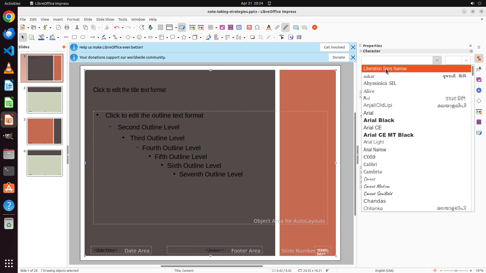 - 大纲内容文本框(显示 'Click to edit the outline text format')的字体属性显示为 'Liberation Sans Narrow'