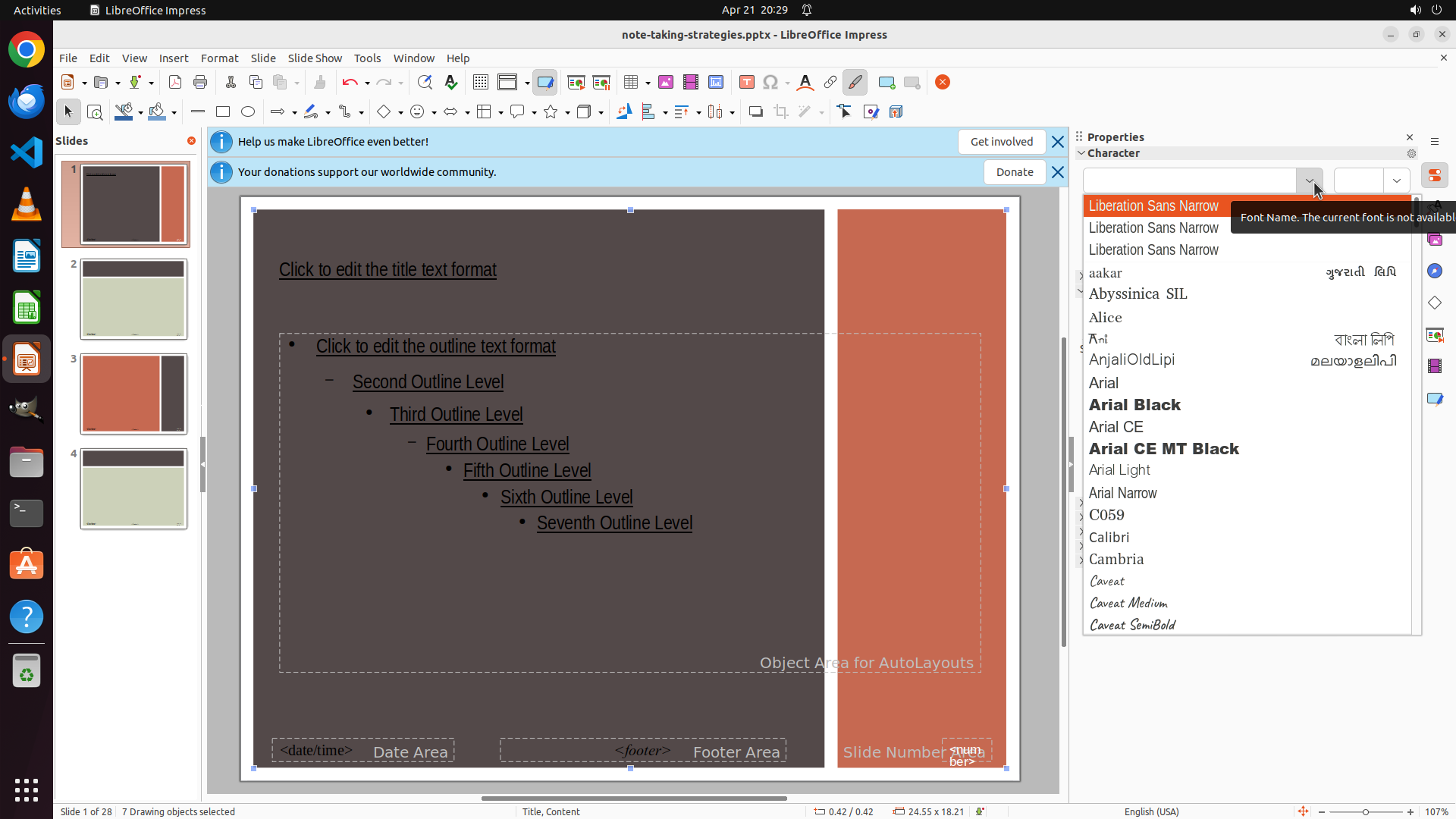 - 大纲内容文本框(显示 'Click to edit the outline text format')的字体属性显示为 'Liberation Sans Narrow'