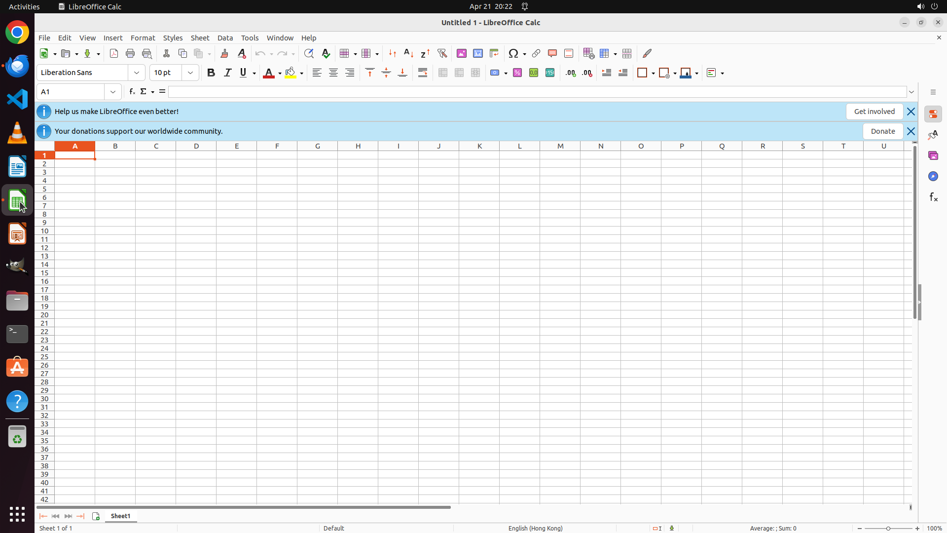 现在我需要打开 LibreOffice Calc 来创建报告。我可以在左侧边栏看到 LibreOffice Calc 的图标(绿色电子表格图标)。