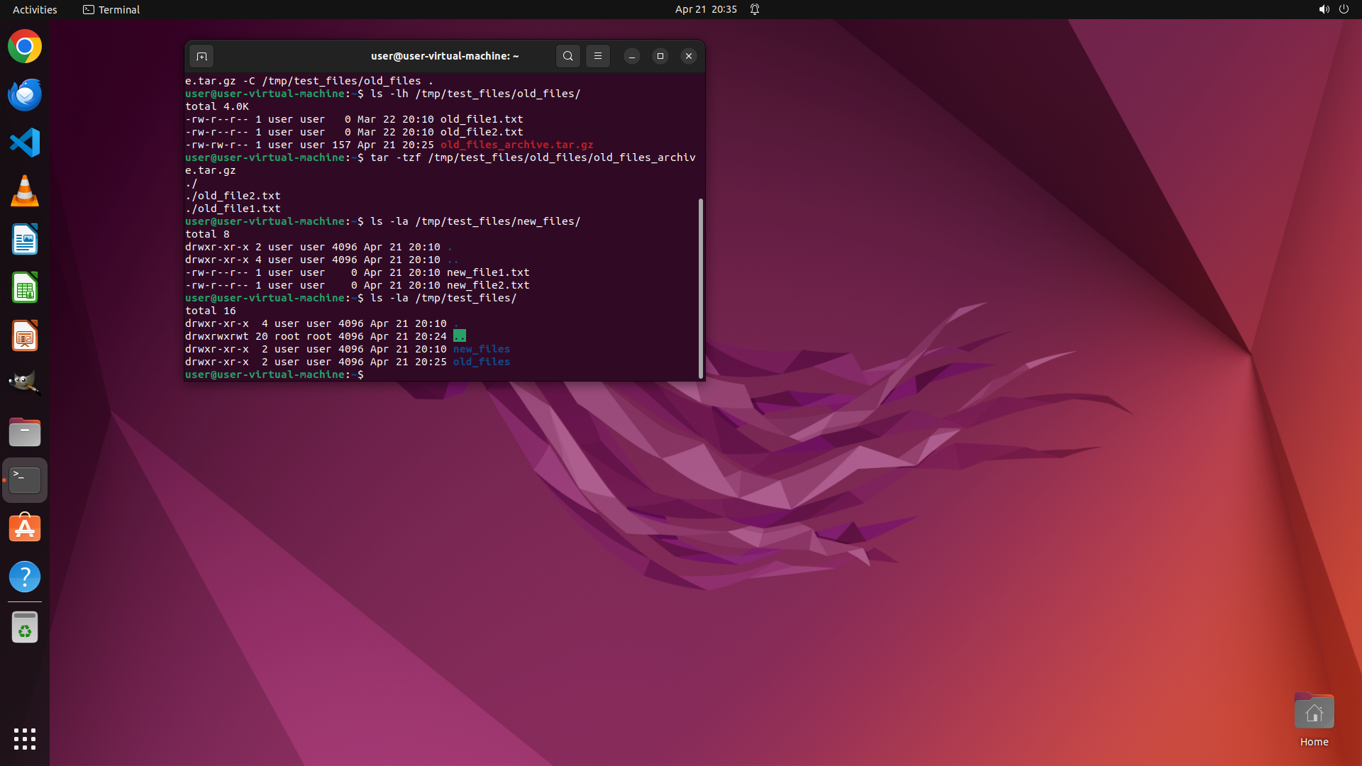 - 上一个命令尝试创建压缩包:`tar -czf /tmp/test_files/old_files/old_files_archive.tar.gz -C /tmp/test_files/old_files .`