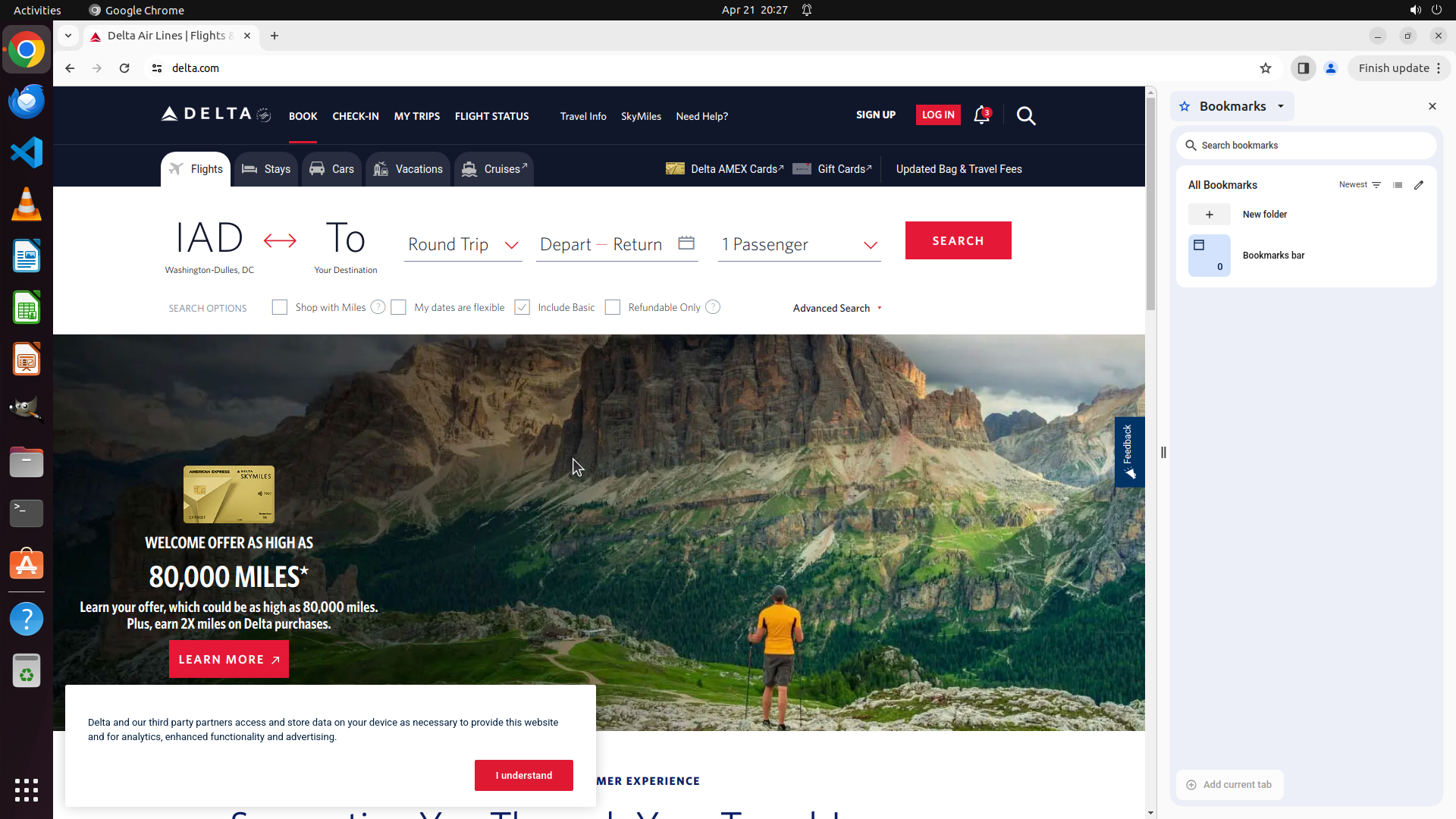 **Context**: The system date is displayed in the top status bar as 'Apr 21 20:18'. This is important for determining the correct departure date for the flight search, which would be April 22nd.