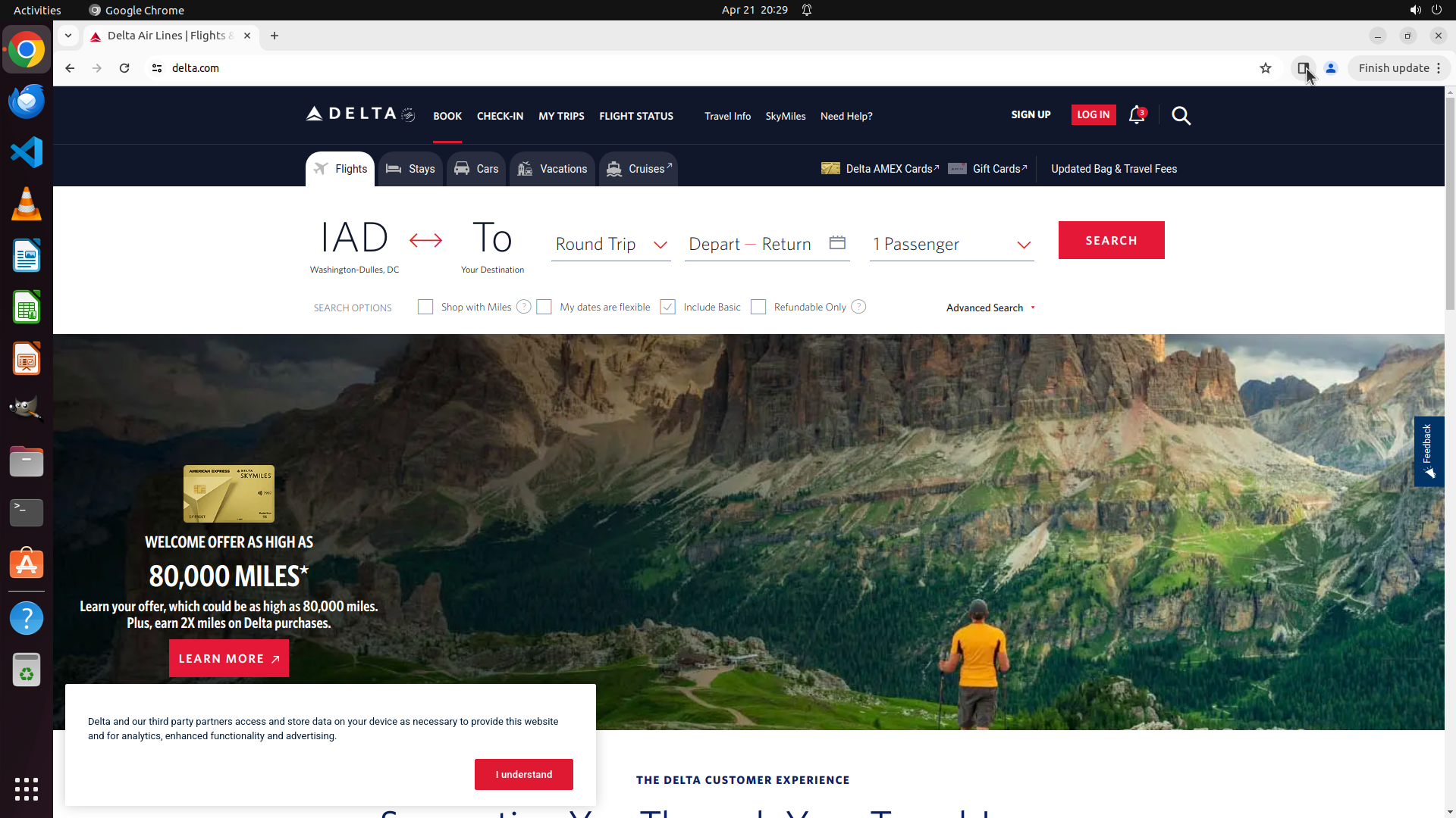 **Context**: The system date is displayed in the top status bar as 'Apr 21 20:18'. This is important for determining the correct departure date for the flight search, which would be April 22nd.