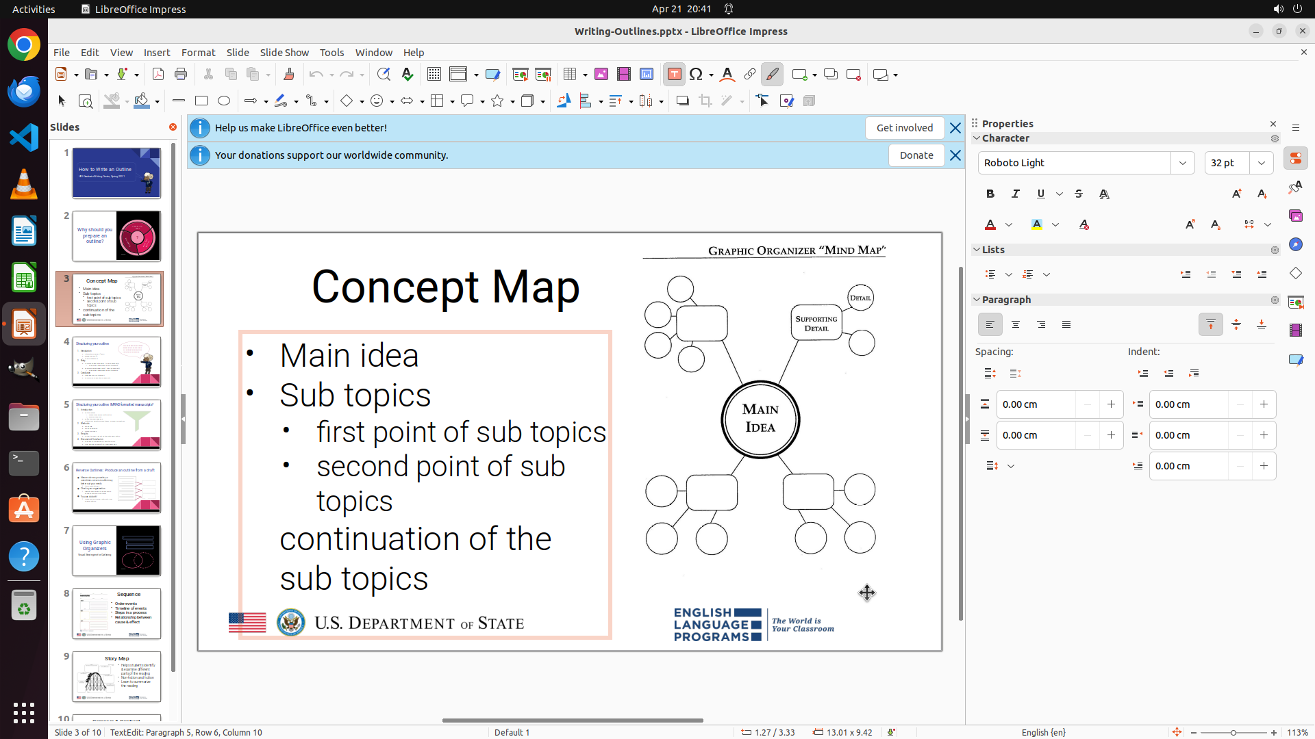 你的任务是:借助工具,来操作一台电脑来达成任务: I want to do something like the following on Page 3 of the current LibreOffice Impress file: make the "continuation of the sub topics" indented the same as "main idea" and "sub topics" without a bullet in front of it. Could you help me with it?。