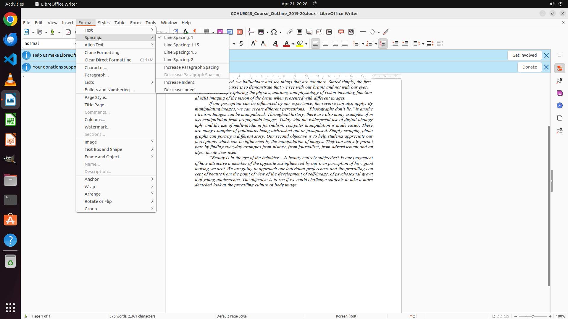2. **文档内容性质**:现有文本是关于视觉感知、幻觉、图像操纵和美的学术性内容,是一份课程大纲(文件名显示为 "CCHU9045_Course_Outline_2019-20.docx"),不是用户需要练习写作的那篇需要特定格式(intro单倍、body双倍、conclusion 1.5倍行距)的作文。