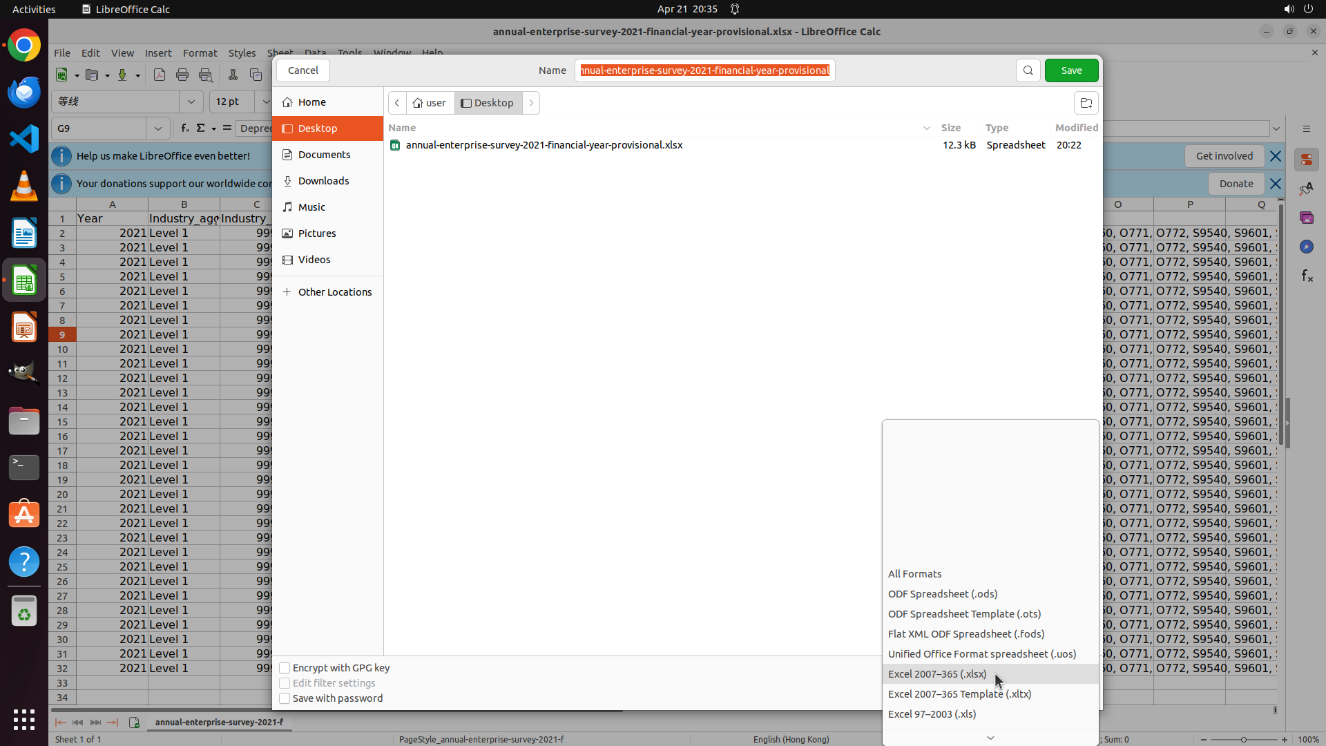 ## 6. 上一次操作的前50步操作简述 ### 步骤 1: - 描述: ``` #### 重要信息 LibreOffice Calc 已经打开了一个名为 "annual-enterprise-survey-2021-financial-year-provisional.xlsx" 的文件。我可以看到电子表格数据,包含 Year、Industry_aggregation、Industry_code、Units、Variable_code、Variable_name、Variable_category、Value 等列,以及 2021 Level 1 和 Depreciation 等数据行。 #### 情况分析与思考过程 当前任务是: 1. 将打开的 .xlsx 文件导出为 HTML 格式 2. 在 Chrome 浏览器中打开导出的 HTML 文件 我需要: 1. 首先点击 File 菜单,然后选择 Save As 或 Export 选项来导出为 HTML 2. 选择 HTML 格式并保存文件 3. 然后打开 Chrome 浏览器 4. 在 Chrome 中打开保存的 HTML 文件 现在开始第一步:点击 File 菜单开始导出流程。 ``` - 操作: 1. 左键单击坐标 (0.044, 0.069) ### 步骤 2: - 描述: ``` #### 重要信息 LibreOffice Calc 的 File 菜单已经成功打开。我可以看到菜单中包括 "Save As..." 和 "Export..." 选项。文件名为 "annual-enterprise-survey-2021-financial-year-provisional.xlsx",包含 Year、Industry_aggregation、Industry_code 等列的数据。 #### 情况分析与思考过程 上一步操作成功打开了 File 菜单。现在我需要选择 "Save As..." 选项来导出文件为 HTML 格式。在 LibreOffice Calc 中,"Save As..." 允许选择不同的文件格式,包括 HTML。 接下来的步骤: 1. 点击 "Save As..." 选项 2. 在弹出的对话框中选择 HTML 格式 3. 指定保存位置并保存 4. 然后打开 Chrome 浏览器查看 HTML 文件 现在点击 "Save As..." 选项继续导出流程。 ``` - 操作: 1. 左键单击坐标 (0.065, 0.323) </SITUATION>