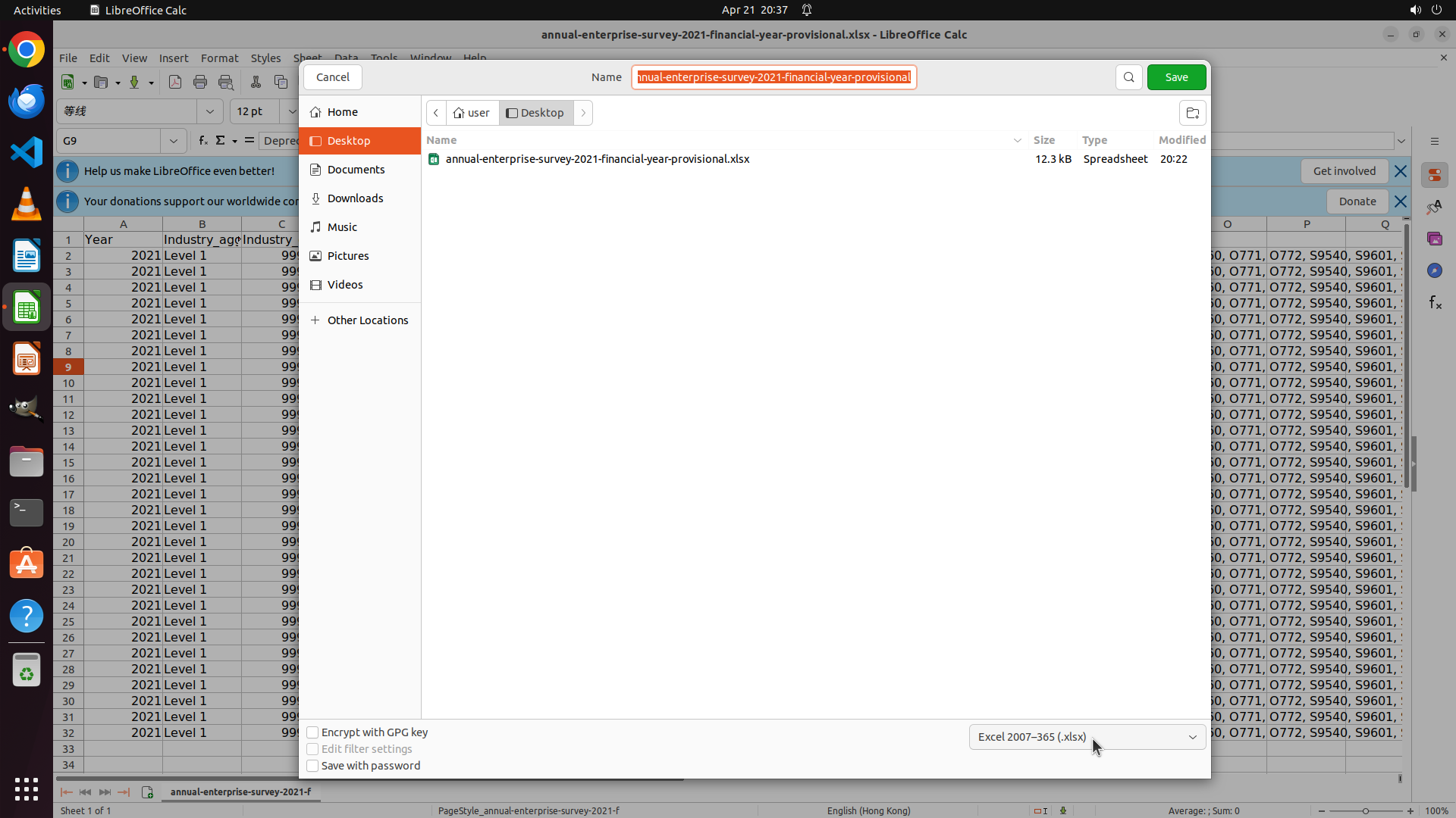 ## 6. 上一次操作的前50步操作简述 ### 步骤 1: - 描述: ``` #### 重要信息 LibreOffice Calc 已经打开了一个名为 "annual-enterprise-survey-2021-financial-year-provisional.xlsx" 的文件。我可以看到电子表格数据,包含 Year、Industry_aggregation、Industry_code、Units、Variable_code、Variable_name、Variable_category、Value 等列,以及 2021 Level 1 和 Depreciation 等数据行。 #### 情况分析与思考过程 当前任务是: 1. 将打开的 .xlsx 文件导出为 HTML 格式 2. 在 Chrome 浏览器中打开导出的 HTML 文件 我需要: 1. 首先点击 File 菜单,然后选择 Save As 或 Export 选项来导出为 HTML 2. 选择 HTML 格式并保存文件 3. 然后打开 Chrome 浏览器 4. 在 Chrome 中打开保存的 HTML 文件 现在开始第一步:点击 File 菜单开始导出流程。 ``` - 操作: 1. 左键单击坐标 (0.044, 0.069) ### 步骤 2: - 描述: ``` #### 重要信息 LibreOffice Calc 的 File 菜单已经成功打开。我可以看到菜单中包括 "Save As..." 和 "Export..." 选项。文件名为 "annual-enterprise-survey-2021-financial-year-provisional.xlsx",包含 Year、Industry_aggregation、Industry_code 等列的数据。 #### 情况分析与思考过程 上一步操作成功打开了 File 菜单。现在我需要选择 "Save As..." 选项来导出文件为 HTML 格式。在 LibreOffice Calc 中,"Save As..." 允许选择不同的文件格式,包括 HTML。 接下来的步骤: 1. 点击 "Save As..." 选项 2. 在弹出的对话框中选择 HTML 格式 3. 指定保存位置并保存 4. 然后打开 Chrome 浏览器查看 HTML 文件 现在点击 "Save As..." 选项继续导出流程。 ``` - 操作: 1. 左键单击坐标 (0.065, 0.323) ### 步骤 3: - 描述: - 操作: 1. 左键单击坐标 (0.748, 0.898) </SITUATION>